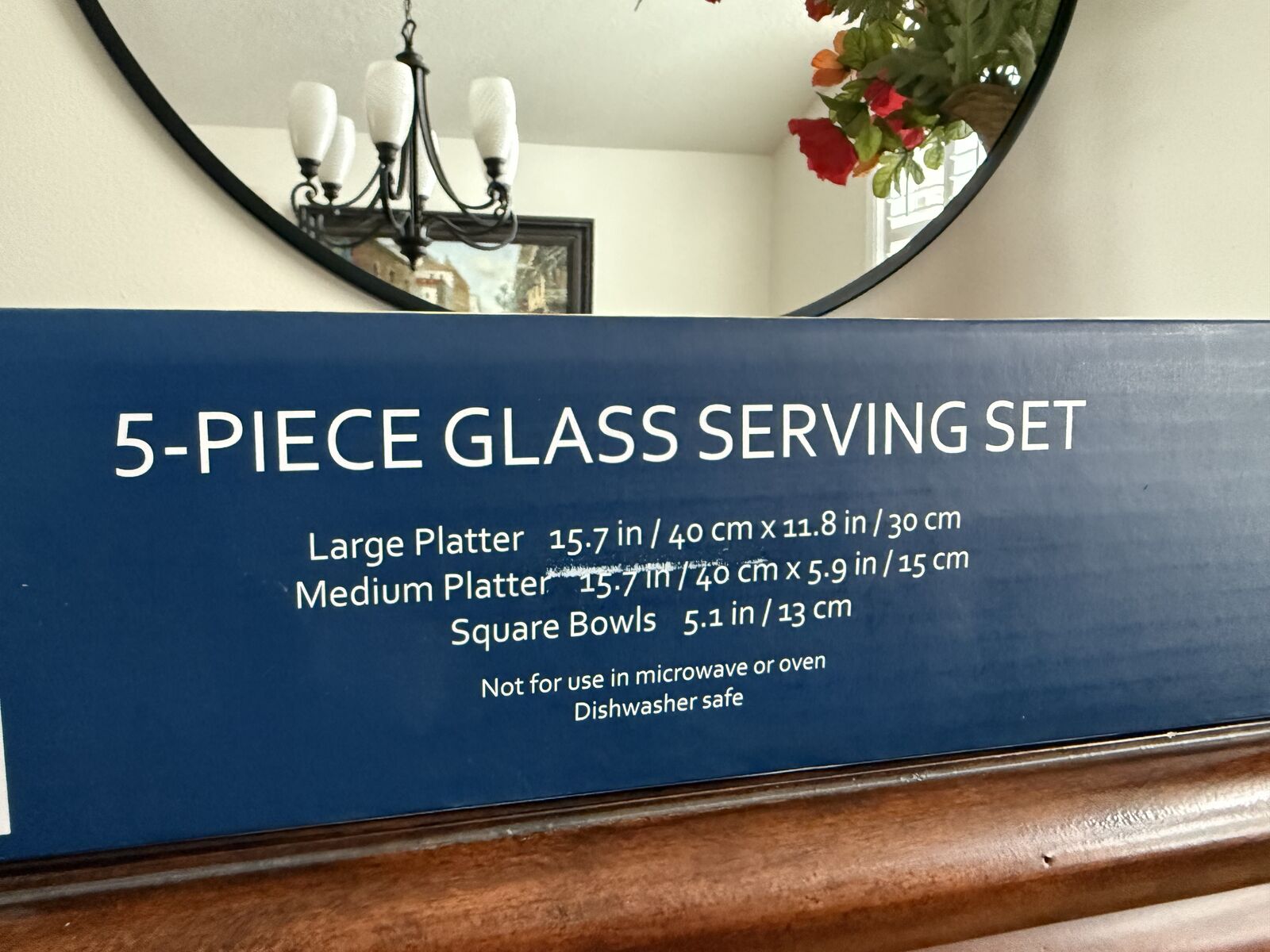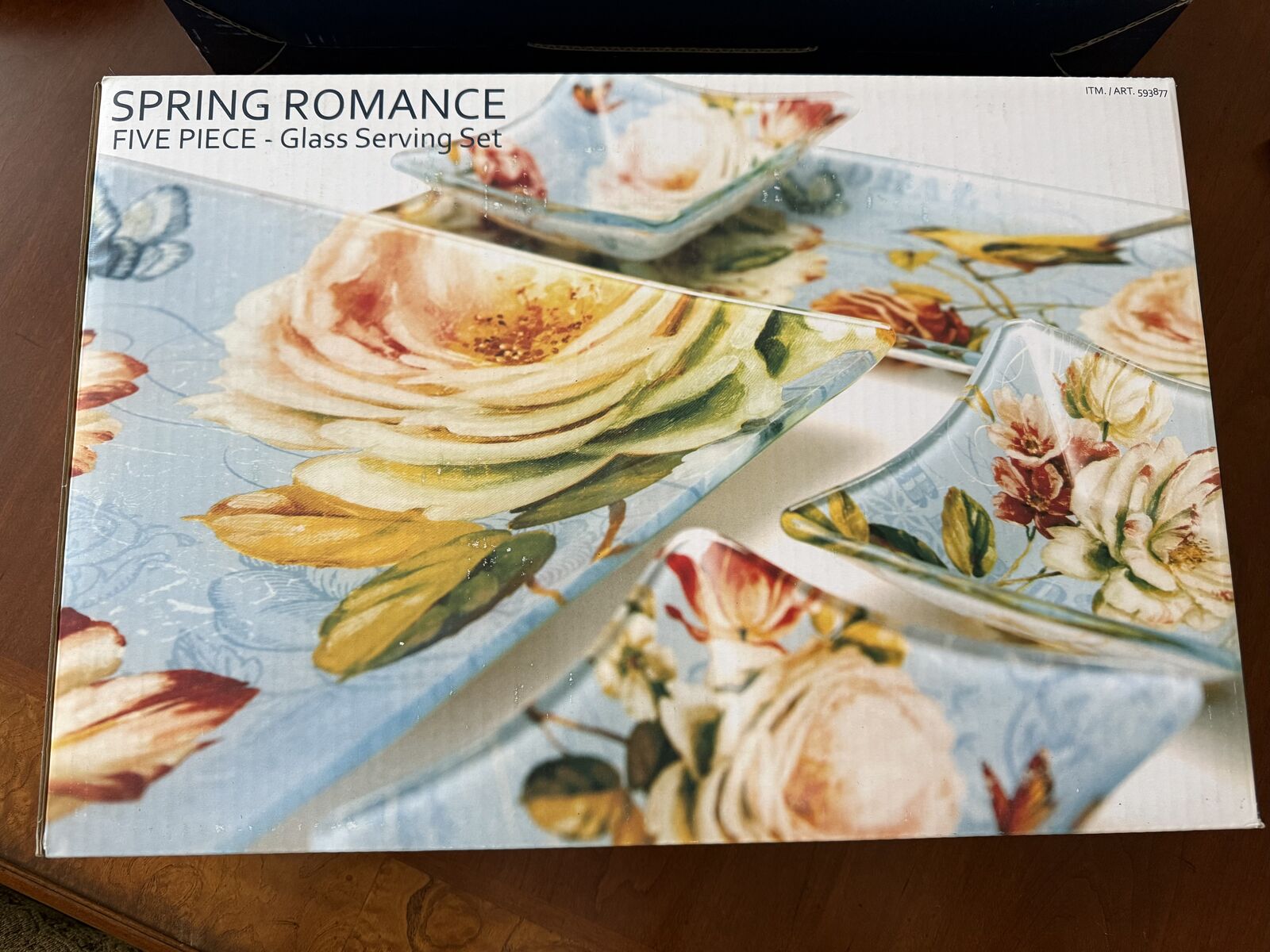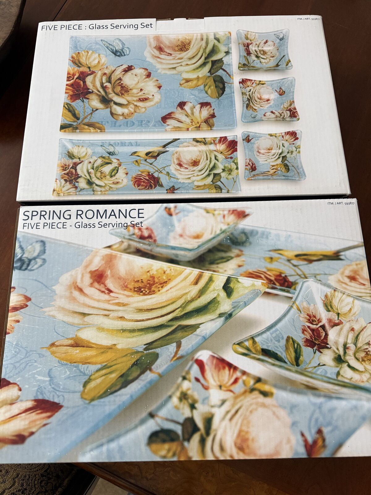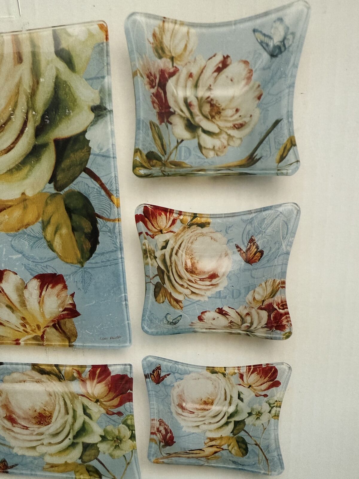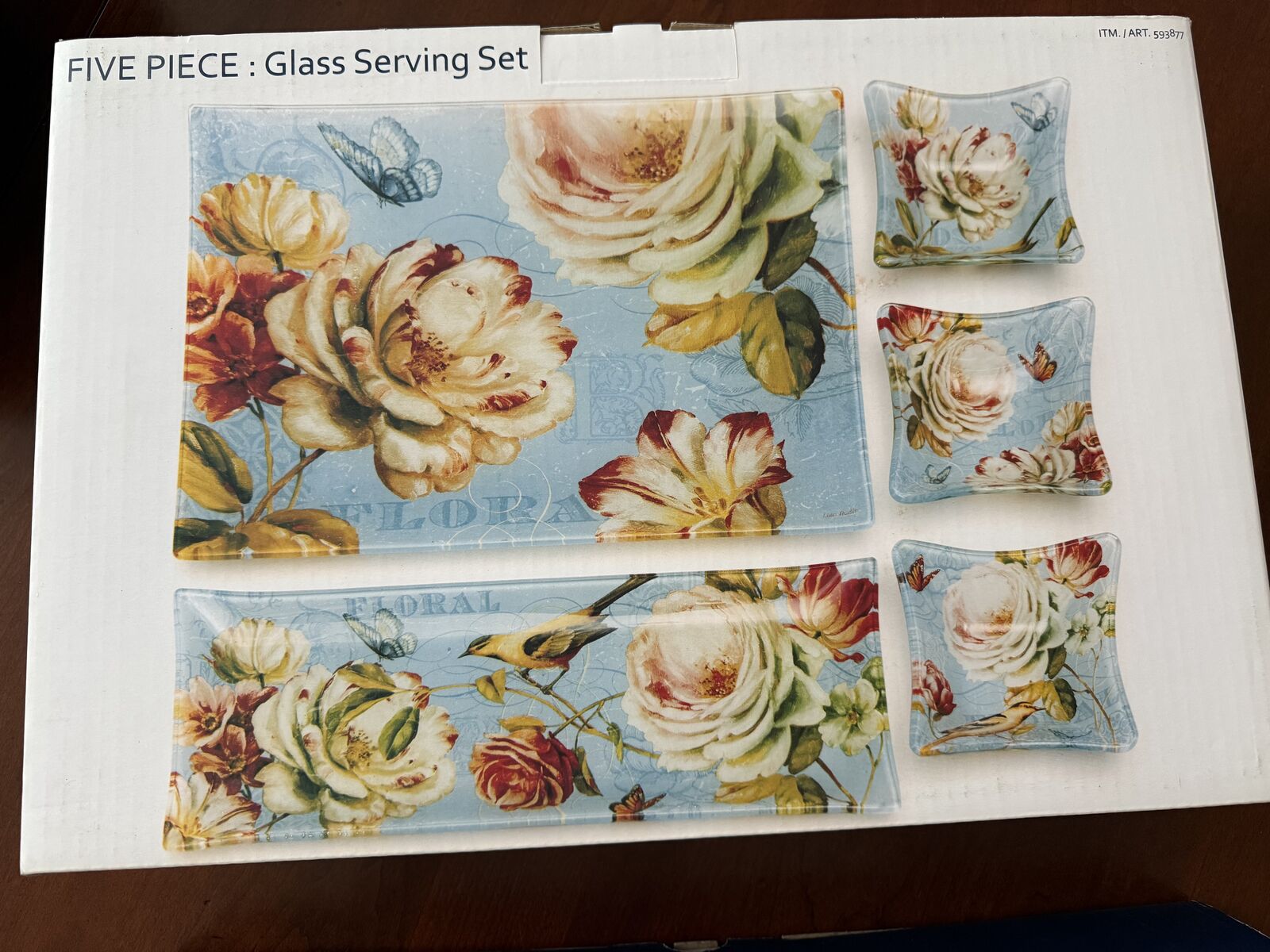 VenmoNEW in the original box . These 5 glass floral serving plates are beautiful! Never been used! dimensions are large platter 15.7" x 11.7, medium platter 15.7"x 5.7" square bowls 5.1 "