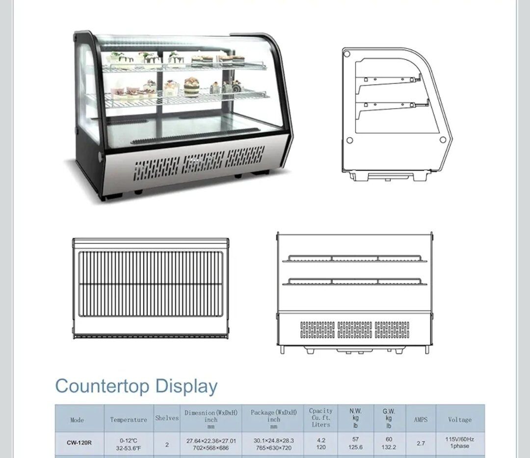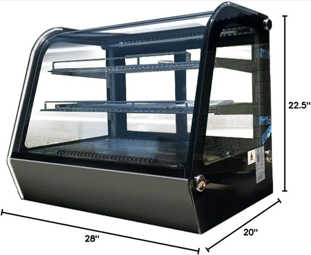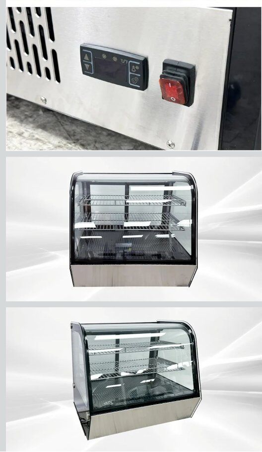 Bakery Display Cooler Refrigerated Case Countertop Desktop Slope Round-Corner 28 ins Commercial refrigerator for Pastry Deli Wide Stainless Steel Base Curved Glass Food Cooler Glass