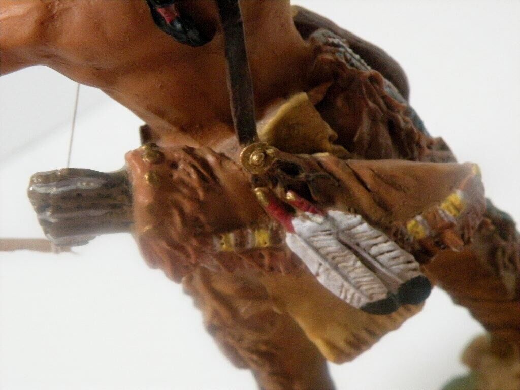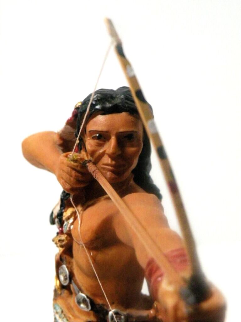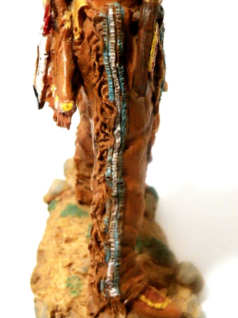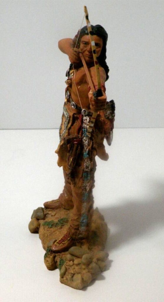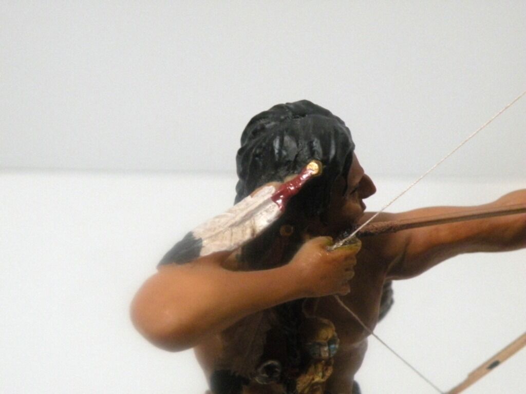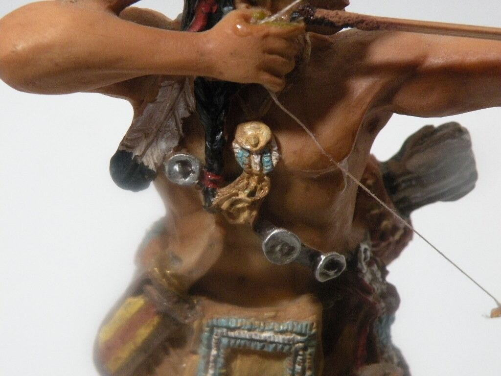 He stands 8 inches and is dressed in leather looking pants which have braided trim of white and blue running down the pantleg. He has feathers attached to his belt and in the back, he is carrying a quiver filled with arrows. He carries a sheath with a knife inside. He has a cloth on his belt that has the same braid as on his pants. He wears feathers in his hair. He is concentrating all his energy on shooting the arrow to hit his target. His bow is painted with the colors of black, red and white. He wears around his neck a small medicine bag which has the same colors on it as his pants and cloth. The bow is strung with natural string. His feet are securely placed on a rock base on which he is standing. He will be a great