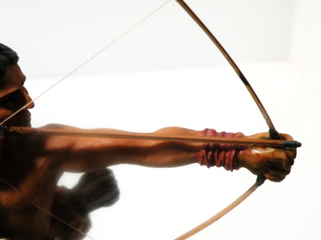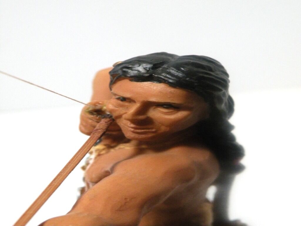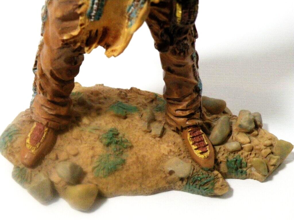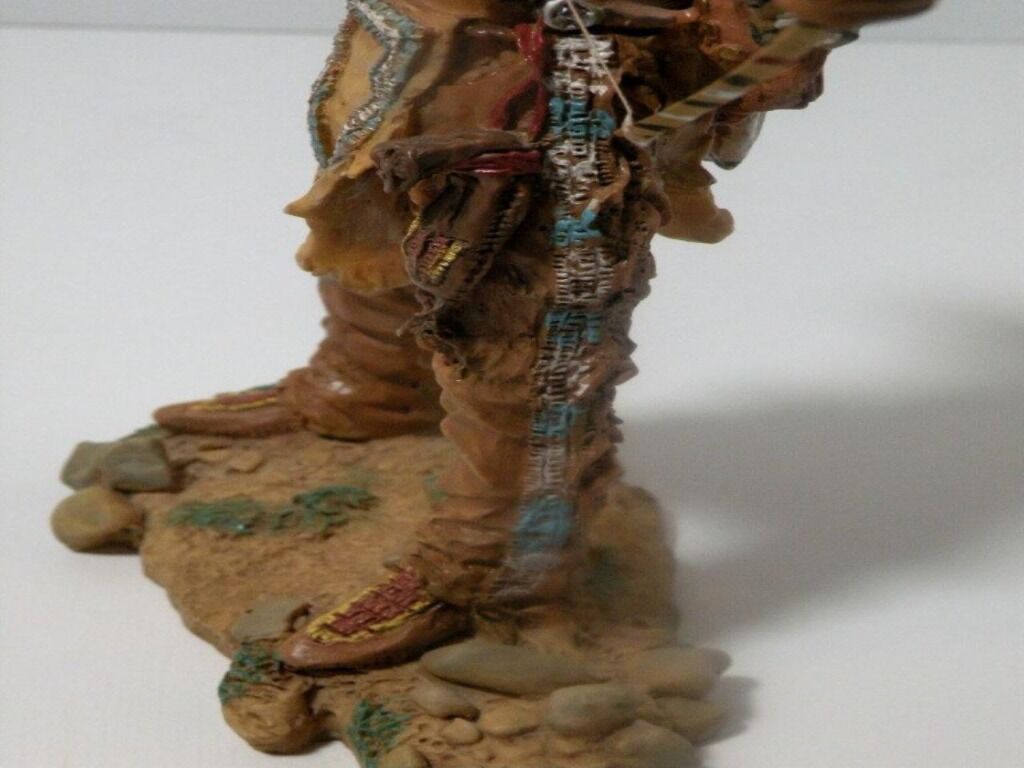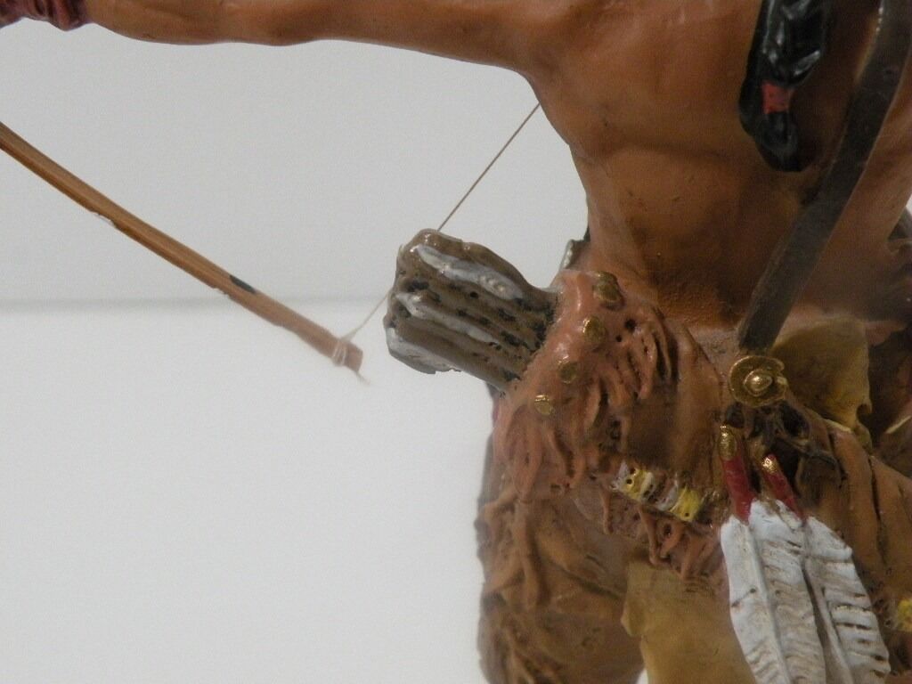 He stands 8 inches and is dressed in leather looking pants which have braided trim of white and blue running down the pantleg. He has feathers attached to his belt and in the back, he is carrying a quiver filled with arrows. He carries a sheath with a knife inside. He has a cloth on his belt that has the same braid as on his pants. He wears feathers in his hair. He is concentrating all his energy on shooting the arrow to hit his target. His bow is painted with the colors of black, red and white. He wears around his neck a small medicine bag which has the same colors on it as his pants and cloth. The bow is strung with natural string. His feet are securely placed on a rock base on which he is standing. He will be a great