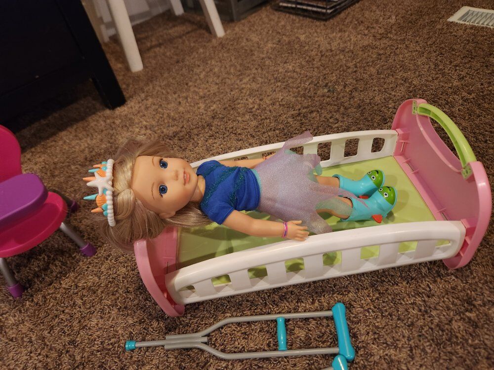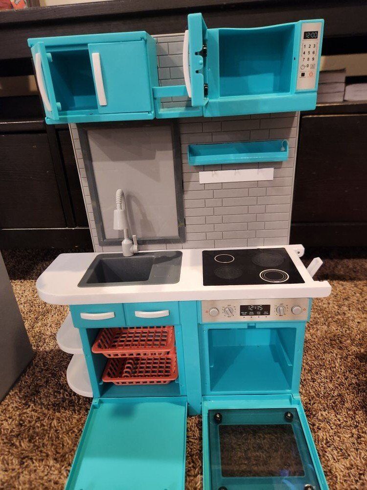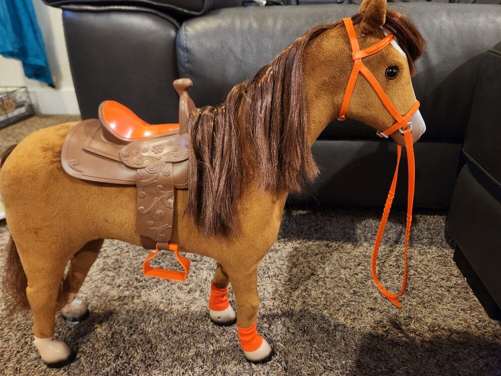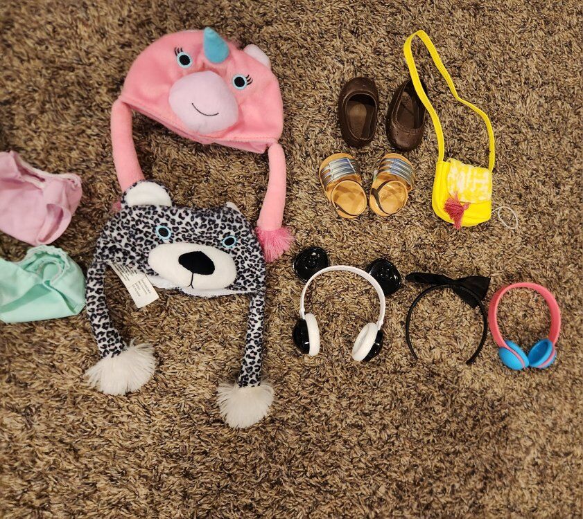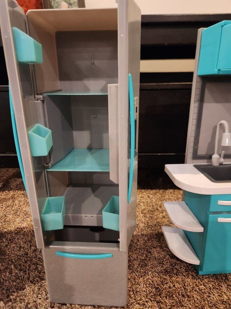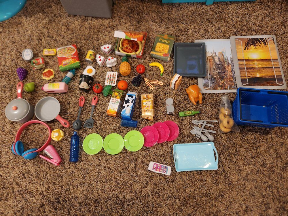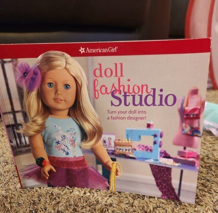 Venmo2 full size American girl dolls, one Wellie Wisher Camille doll, horse with bendable feet & combable hair, lots of clothes, tent, two beds, fridge with ice machine sound effects, sink, stove & oven with boiling sound effects, lots of play food, adjustable salon chair, desk with attached chair, 2 round cozy chairs, American girl doll fashion book, bird with cage, accesories. White round chair in picture not included.