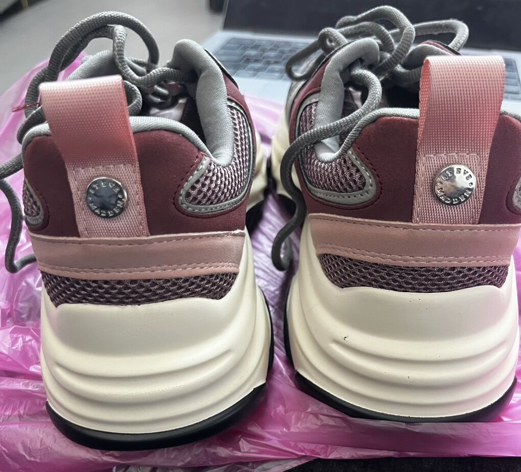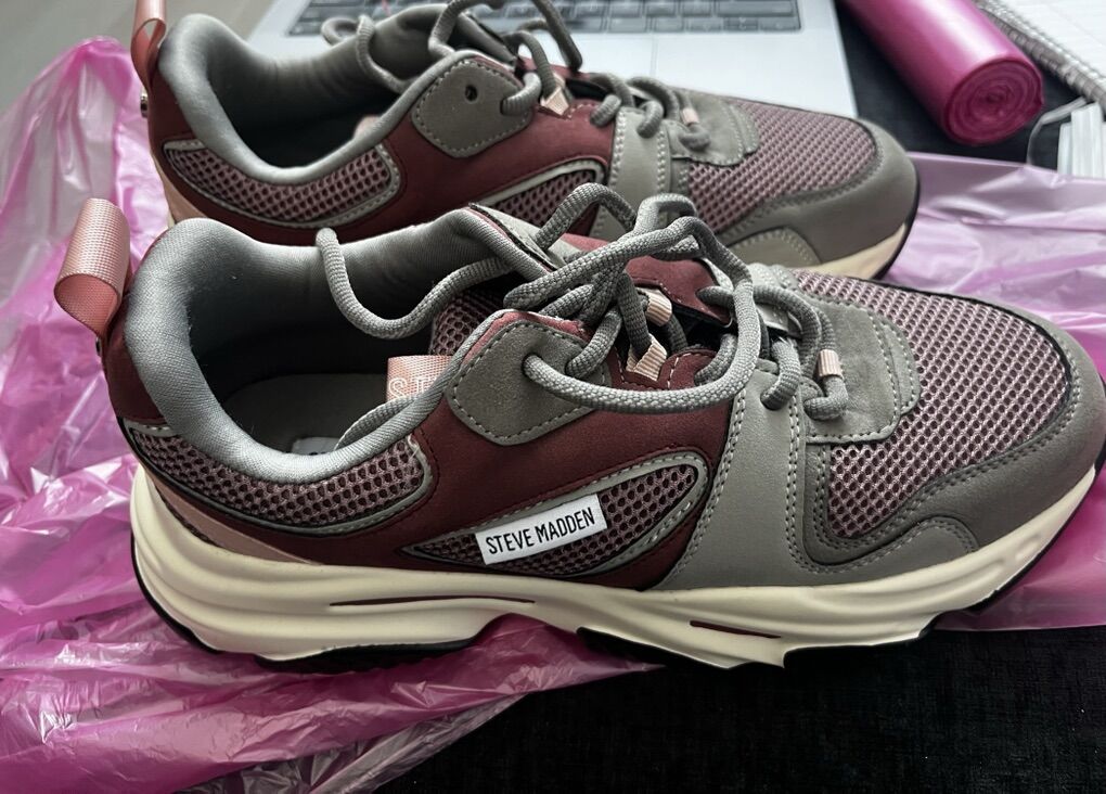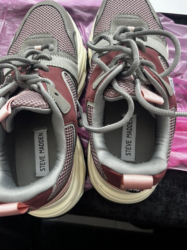 VenmoSize 8M Steve Madden women’s sneakers. Features a chunky platform style sole, color design of gray and maroon/pink. In really good condition.