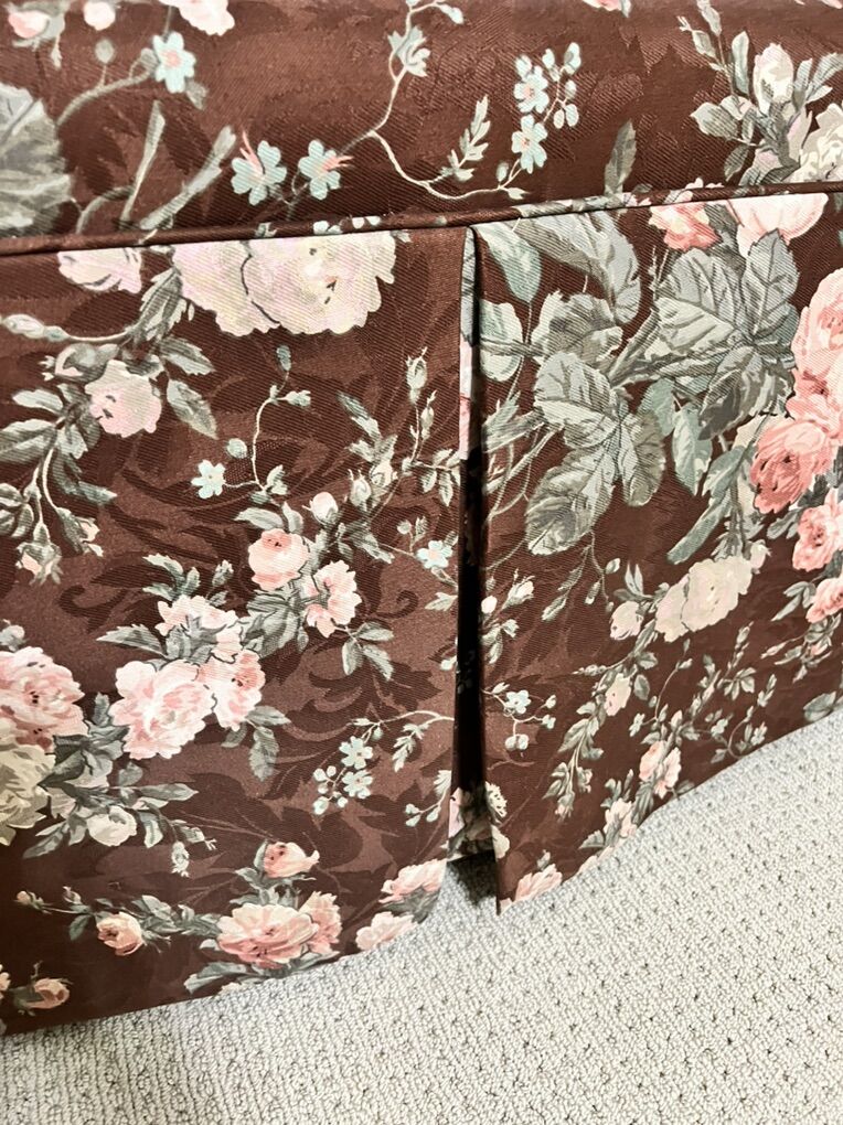 Beautifully upholstered bench with custom fabric. Large enough to put at the end of a bed under a window or up against the wall.
