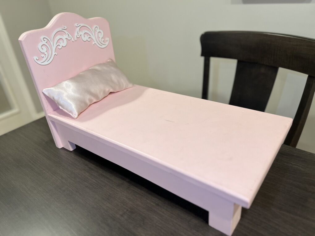Cute pink wooden bed for dolls or stuffed animals. The perfect size for American Girl dolls. There is a small mark in the paint (as you can see in the photos), but otherwise it’s in good shape. The pillow is included.