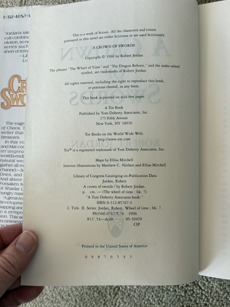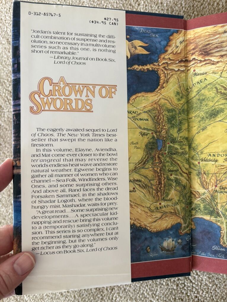 A Crown of Swords: Book 7 in The Wheel of Time series by Robert Jordan. Hardback (larger 9.5” version) in very good condition, including dust jacket. Tor Fantasy. First edition, 1996, 684 pages. Text only. Cash or Venmo.