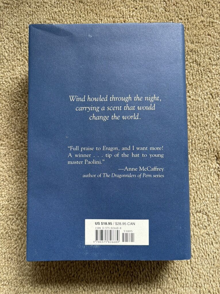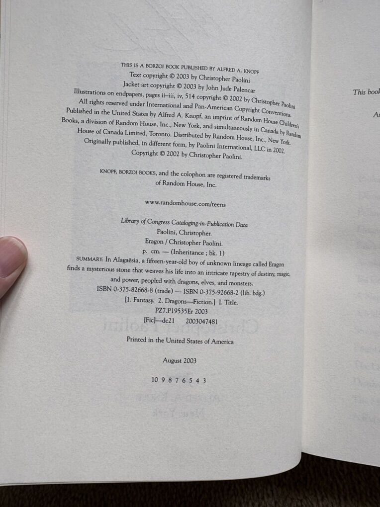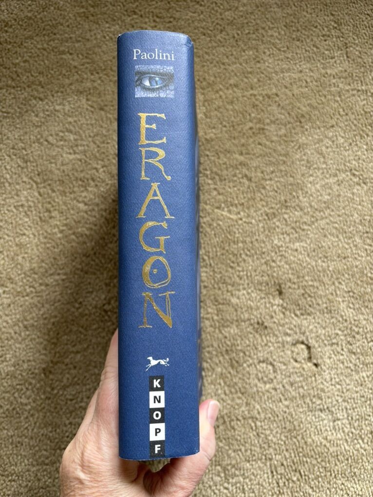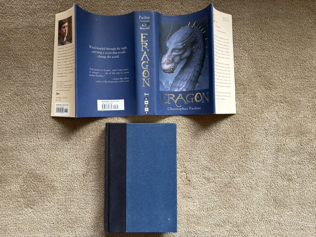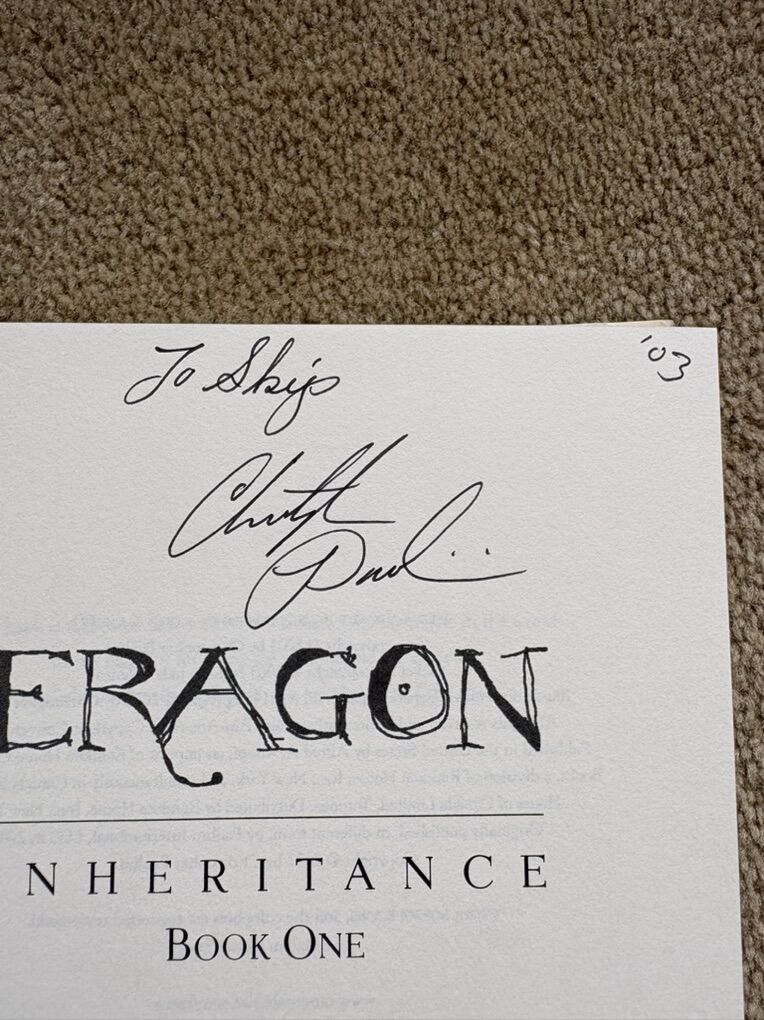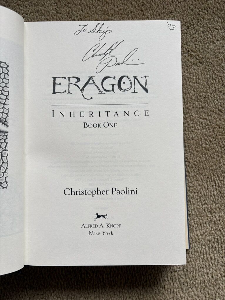 SIGNED Eragon, book 1 of the Inheritance Cycle by Christopher Paolini (2003, 509 pages). Knopf. Title page SIGNED by the author, with inscription: "To Skip, '03, Christopher Paolini" (see photos). First edition, third print. Hardcover in very good condition, including dust jacket (cover has some slight wear--see photos). Text only. Cash or Venmo.