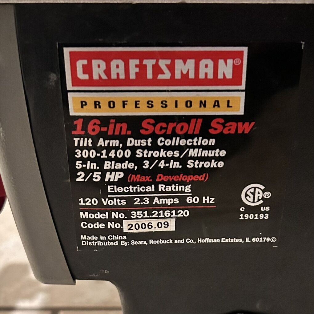 Craftsman professional 16” scroll saw model# 351.224360, tilt arm, dust collection, 2/5HP, 2.3 Amps. Text preferred or leave a voicemail and I’ll get back to you. Check out my other listings open to offers.