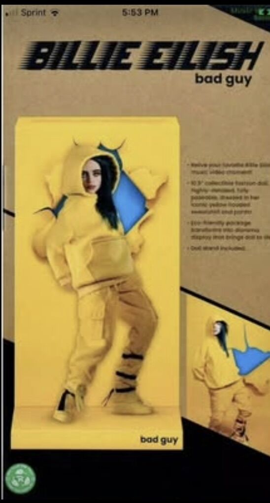 VenmoThe Billie Eilish Bad Guy Fashion Doll is a 10.5-in tall doll that is based on her hit Bad Guy music video. It is highly detailed and fully poseable with 14 points of articulation. The doll is authentic to how she appears in the video and comes dressed in her signature yellow hooded sweatshirt and pants. The doll is packed out in a very eco-friendly, closed box that transforms into a dioramic display replicating the backdrop seen in the music video. Here are some insights from user and expert reviews: Pros Well crafted Fun Movable