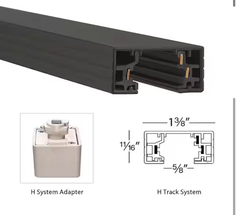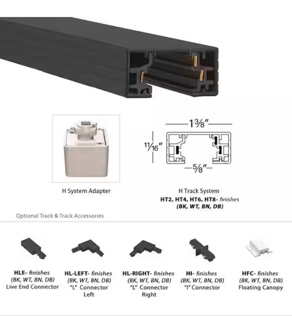 Die cast aluminum construction, 2 end caps and mounting hardware included May be field cut and can easily installed on a variety of surfaces, available in 2 ft., 4 ft., 6 ft., and 8 ft. sizes Power connectors, accessories, suspension options available separately, compliance to California title 24 or ASHRAE 90.1 requirements with WAC track current limiters Single circuit 120-Volt track, power per circuit: 120-Volt, 1920-Watt maximum per circuit, operating current: rated 20 Amp maximum Compatible with H track systems by WAC Lighting, also compatible with Halo track systems Standards: UL and cUL listed for dry locations H Track 8 ft. single circuit 120-Volt with 2 endcaps in black
