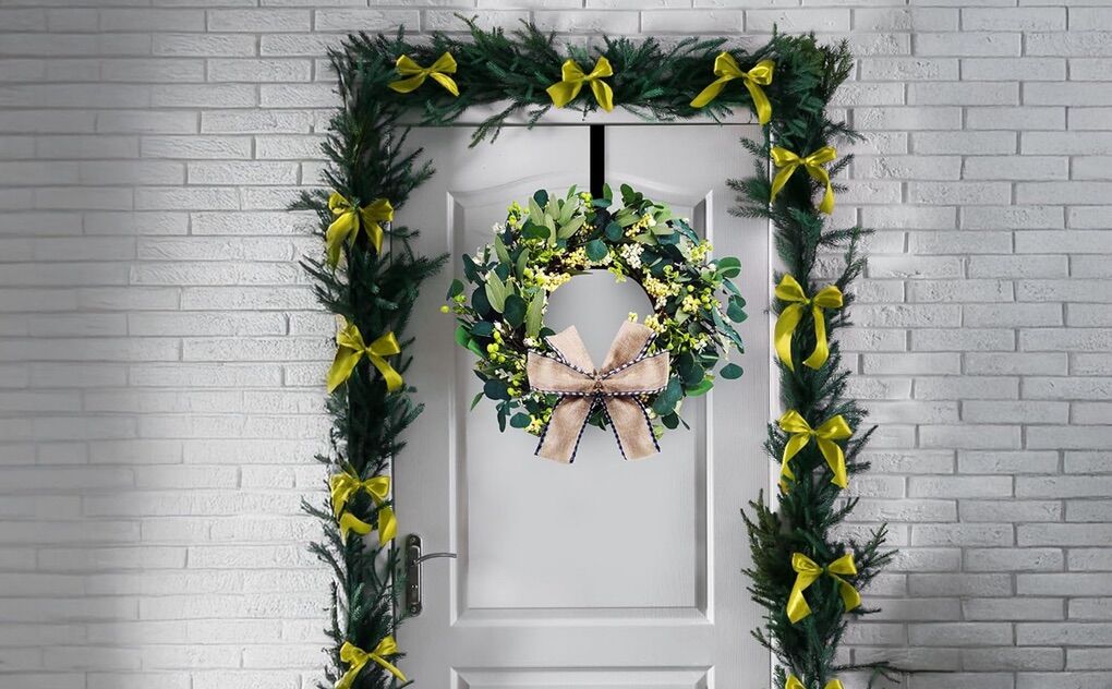 LIFELIKE & FULL EUCALYPTUS WREATH: Handcrafted with premium eucalyptus and boxwood leaves, accented with white, green, and yellow berries for a natural, realistic look. The ribbon is repositionable, allowing you to customize the design to your taste. ALL SEASON VERSATILITY - SPRING TO WINTER: Designed for year-round use—perfect for spring, summer, fall, and winter. Great for front doors, walls, windows, fireplaces, living rooms, porches, and farmhouse-style décor. COMPLETE DECOR SET WITH DOORMAT & HANGER: Comes with a 24x16'' heavy-duty outdoor doormat and a 12'' wreath hanger. Create a stylish and welcoming entryway in seconds with this cohesive set. DURABLE & WEATHER-RESISTANT MATERIALS: The wreath is made from high-quality, fade-resistant materials that last for years without maintenance. The mat is crafted from artificial grass and strong rubber strips, designed to handle heavy foot traffic, rain, snow, and mud. PERFECT SIZE & EASY TO SHAPE: Packed compactly to prevent damage. After fluffing and adjusting the leaves and berries, the wreath expands to a full 24''. Fits all standard doors and looks beautiful when paired with the included doormat. LOW MEINTENANCE & EASY TO CLEAN: Simply wipe the wreath with a dry cloth to keep it fresh. Shake off or rinse the doormat to remove dirt and debris—perfect for busy households.