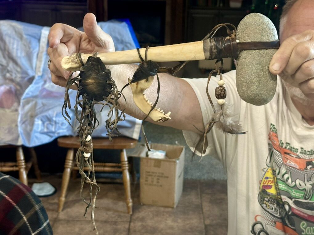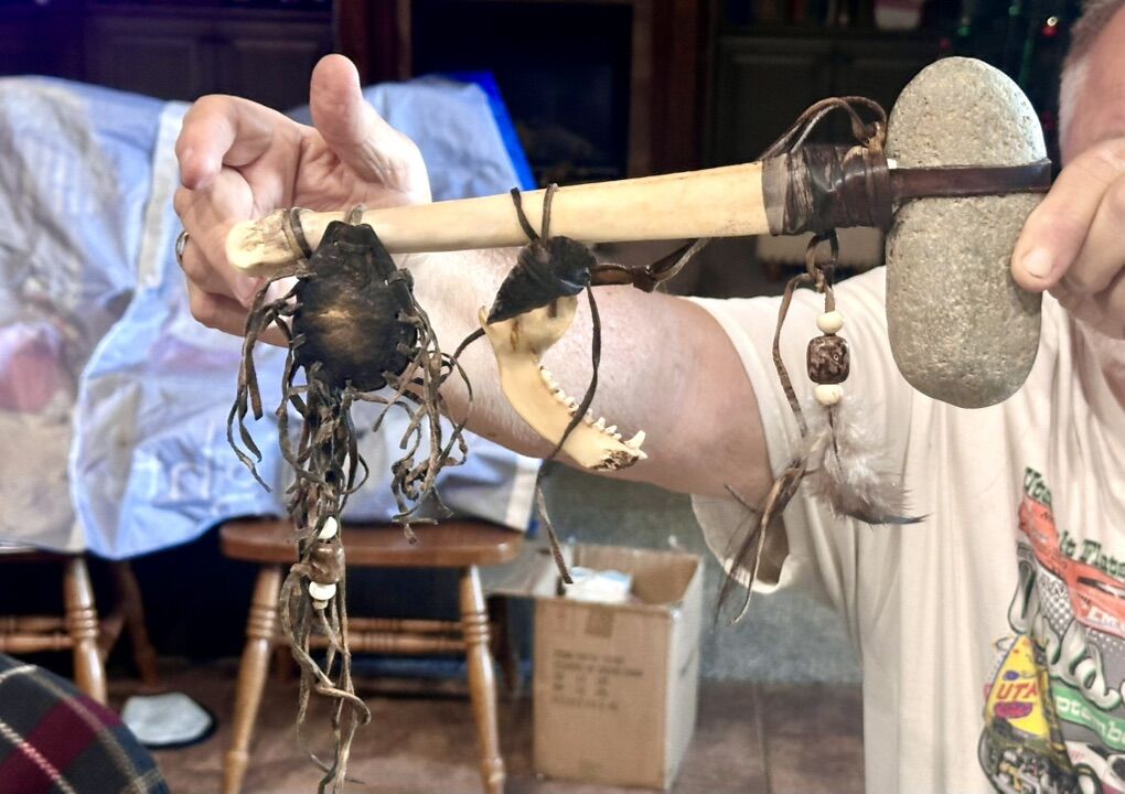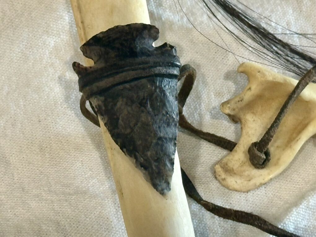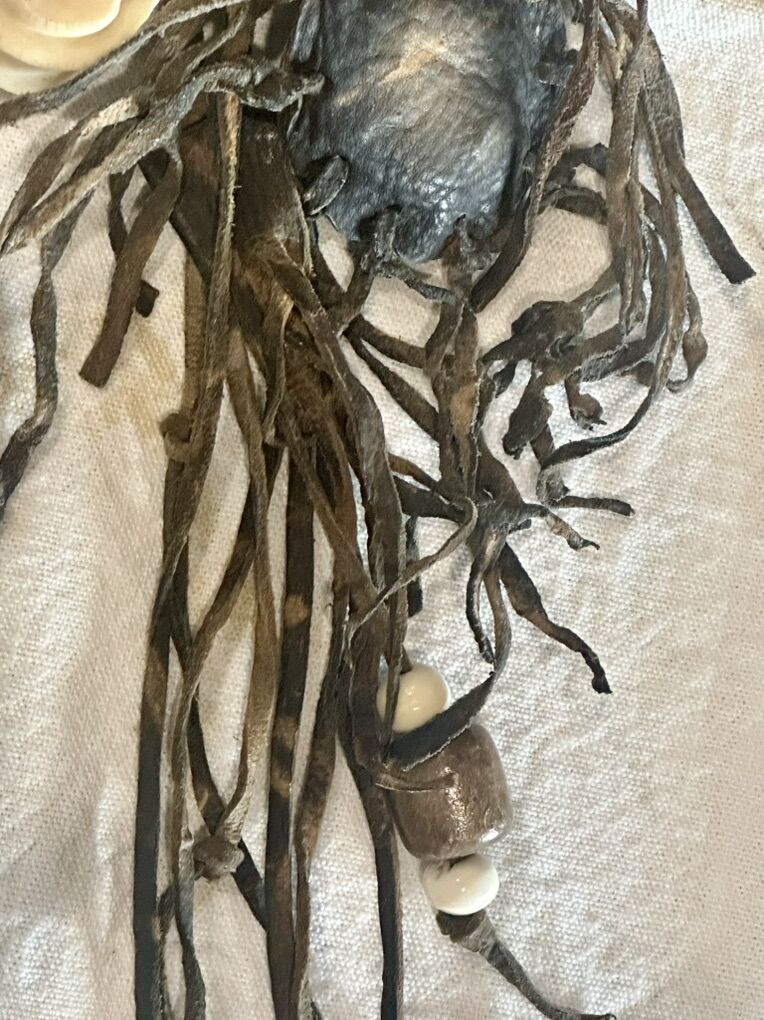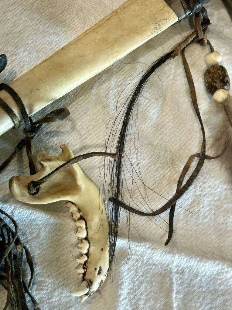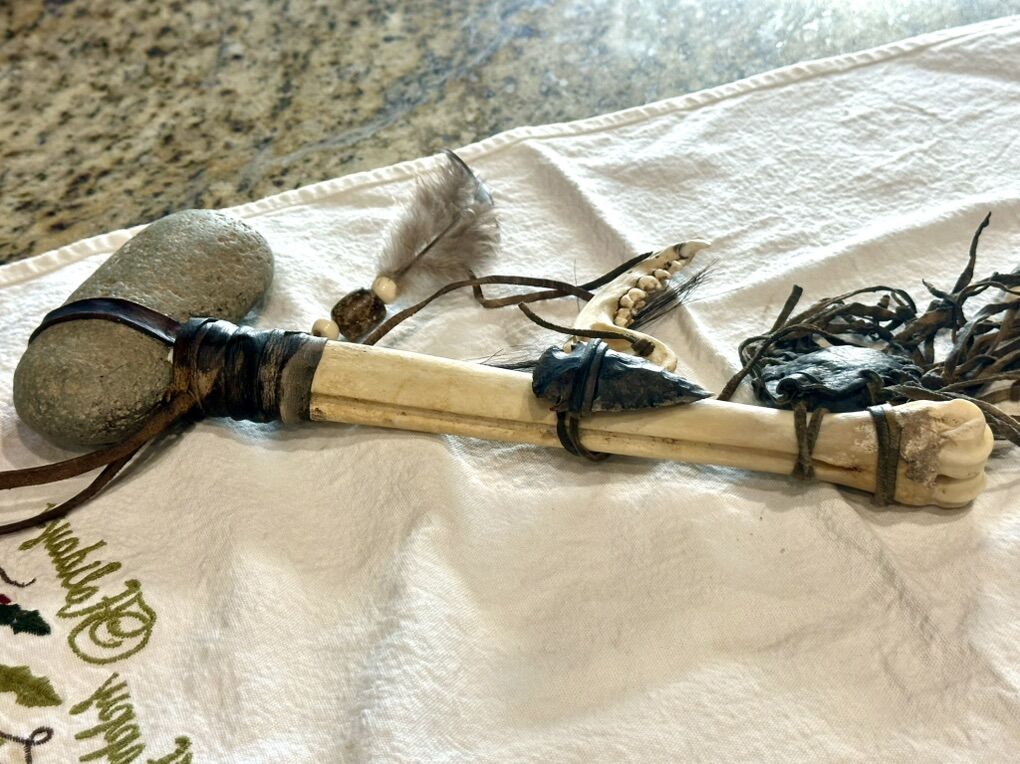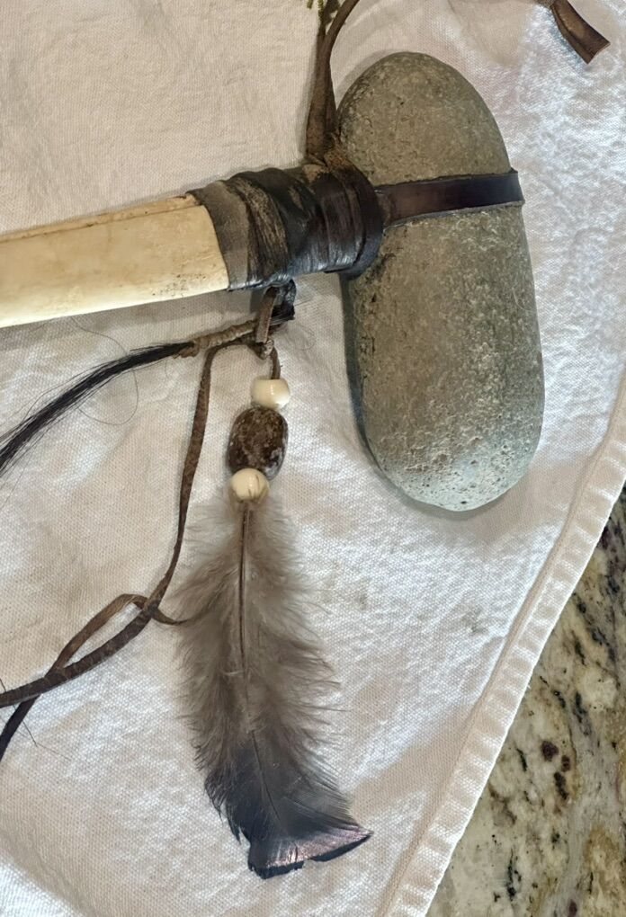 Authentic Navaho made. This decorative tomahawk is tied with real deerskin leather. The head of the tomahawk is crafted from an actual smooth river stone and the genuine bone handle features an attached medicine bag and arrowhead, symbolizing protection and good medicine. It is also adorned with leather fringe, a deer jaw bone and prayer feather as well as horse hair whip.