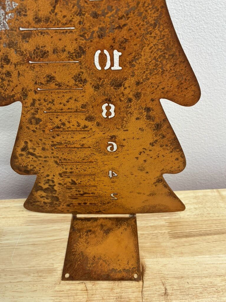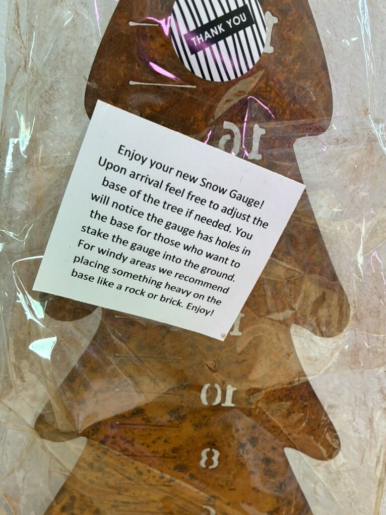 Beautiful “Etsy”made metal tree to measure snow. 25”x9”. Has small holes in the bottom to attach to decking. Whimsical and attractive way to watch the snow accumulate inch by inch!