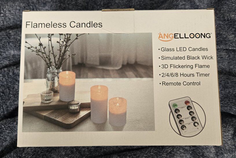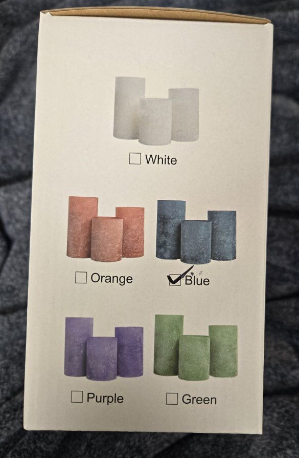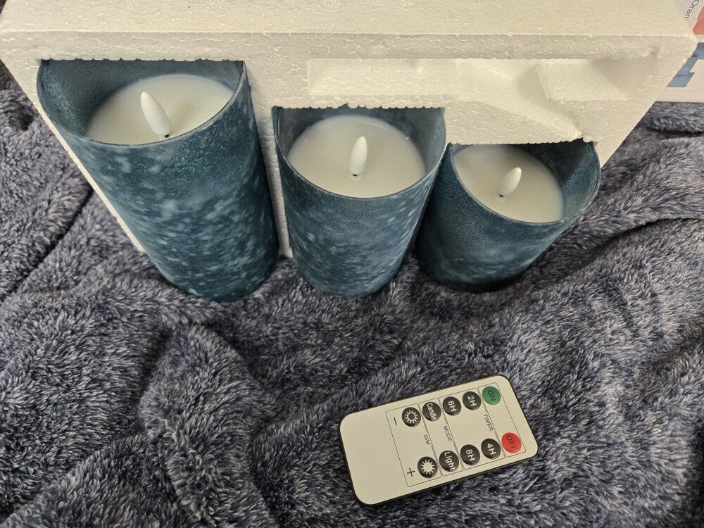 VenmoBrand new flameless glass candle set of 3 candles varying heights with remote control. Blue glass with timer of 2/4/6/8 hours and remote. one candle is 6 inches tall, one is 5 inches tall and the other is 4 inches tall. They are all 3 inches wide. Each candles requires 3 triple A battery.