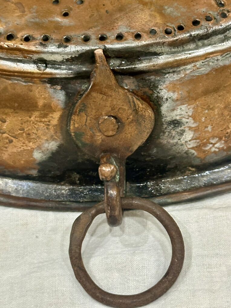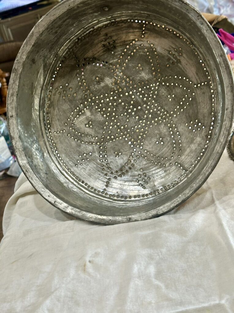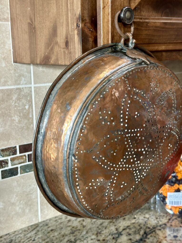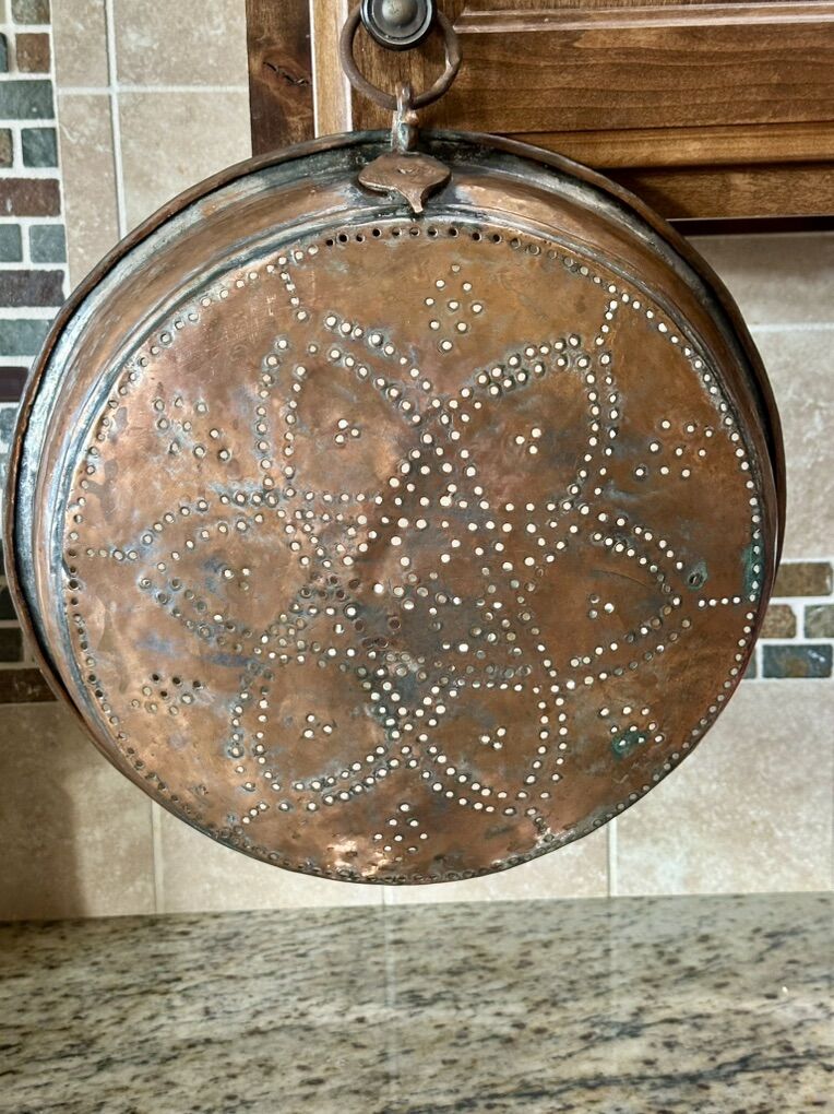 From the late 1800’s to early 1900’s possibly French. Heavy copper sieve has been tinned 14 inches wide by 3.5 High with beautiful punched pattern. Comes with a large copper bowl with rim 14 wide by 5High. The copper was probably tinned for cooking and eating purposes. The Hanging heavy Sieve makes for a beautiful hanging decor for rustic or farmhouse decor.