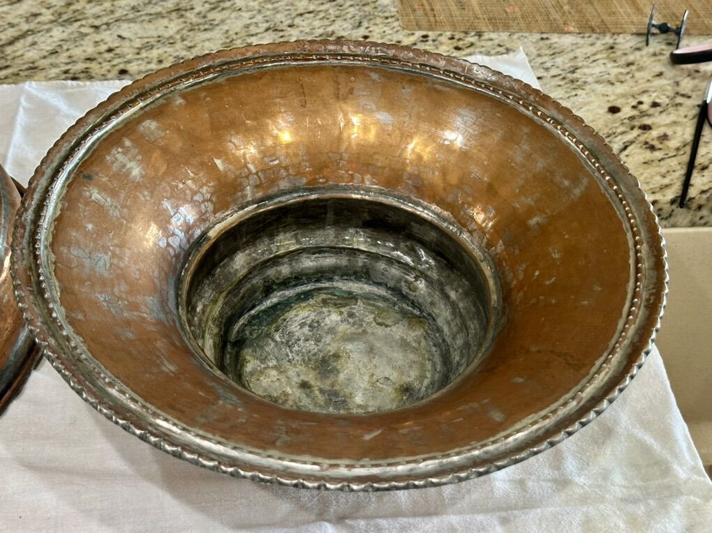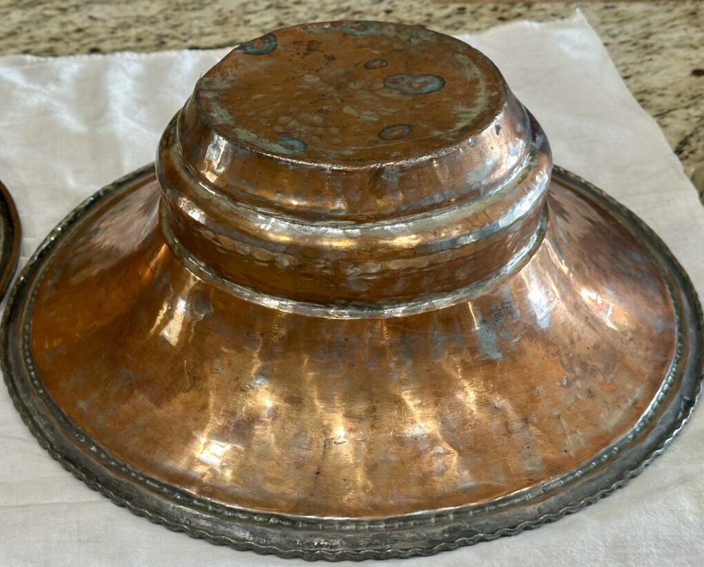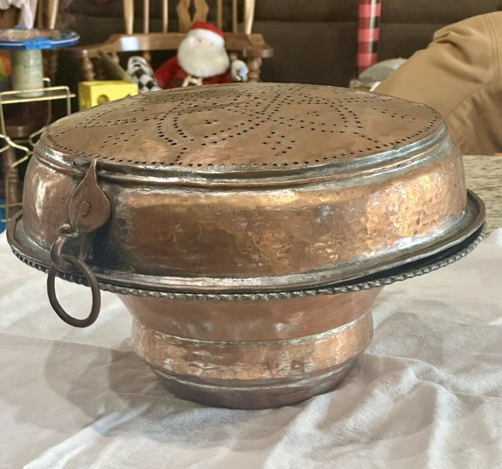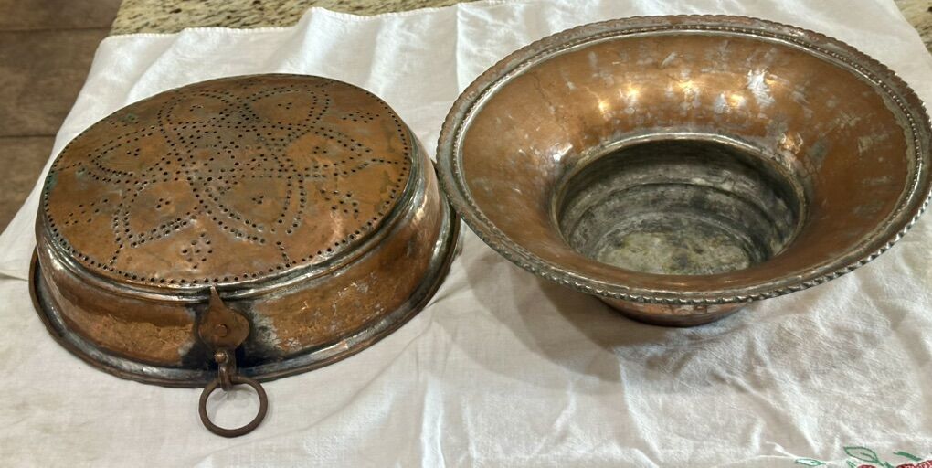 From the late 1800’s to early 1900’s possibly French. Heavy copper sieve has been tinned 14 inches wide by 3.5 High with beautiful punched pattern. Comes with a large copper bowl with rim 14 wide by 5High. The copper was probably tinned for cooking and eating purposes. The Hanging heavy Sieve makes for a beautiful hanging decor for rustic or farmhouse decor.