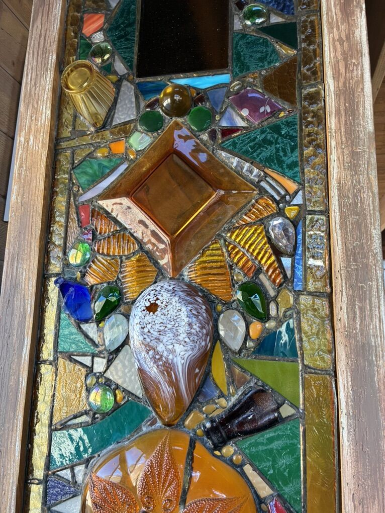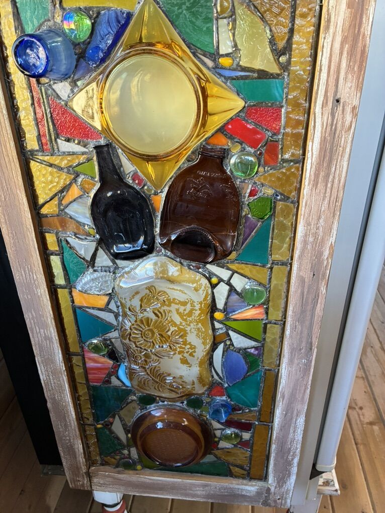 Fabulous stain glass artistically created out of various melted glass pieces. One of a kind from Palm Springs artist. Can be hung vertically or horizontally. Framed in beautiful reclaimed wood. An outstanding piece of artwork.