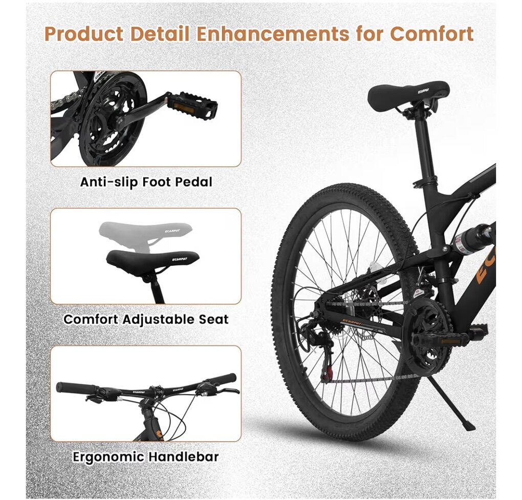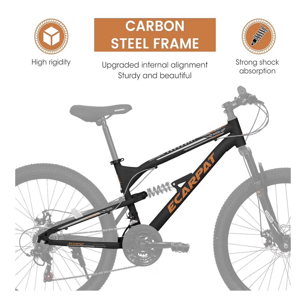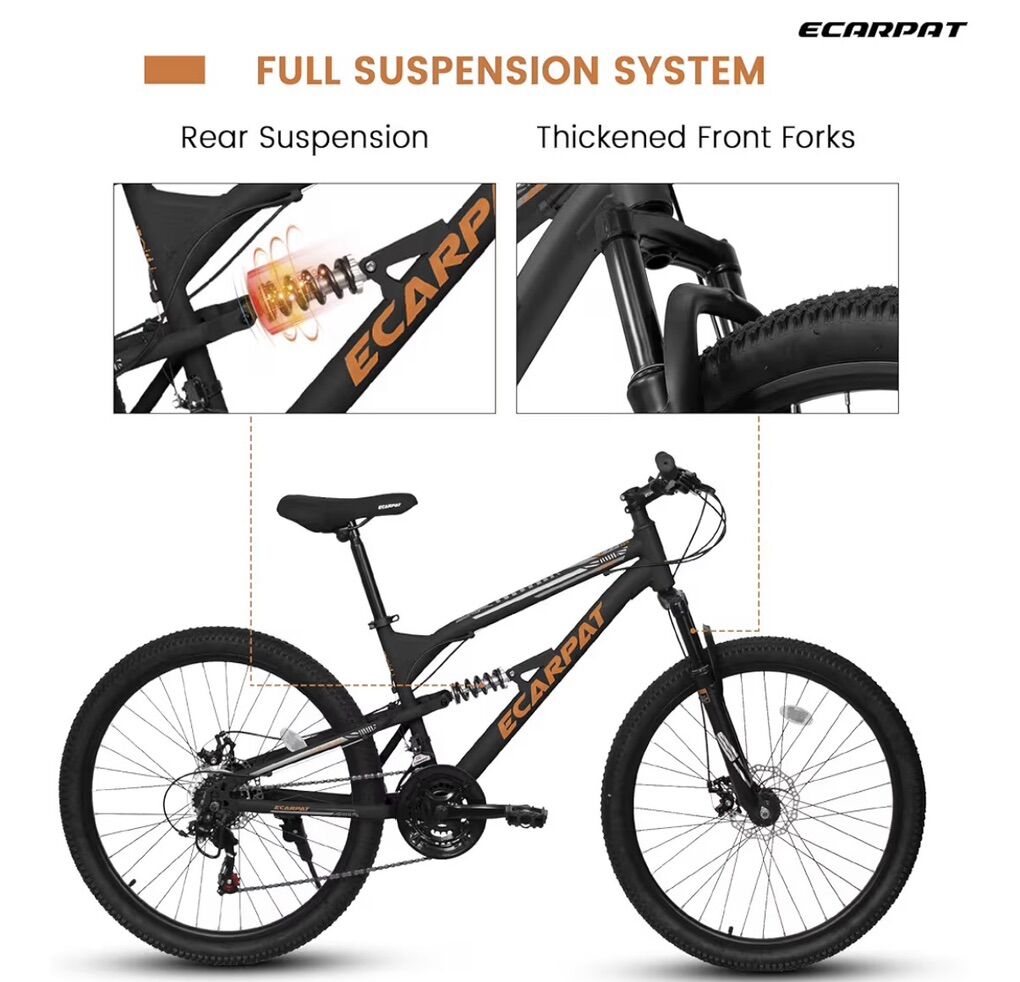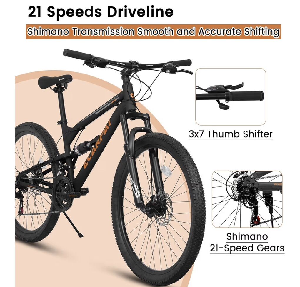 Full Suspension Mountain Bike 26 Inch Wheel, 21-Speed Mountain Bicycle with Dual Disc Brakes Thumb Shifter, Carbon Steel Frame MTB Bike for Teenagers Adult Men Women Trail Commuter.