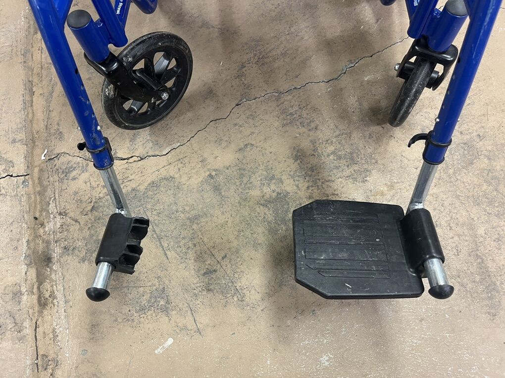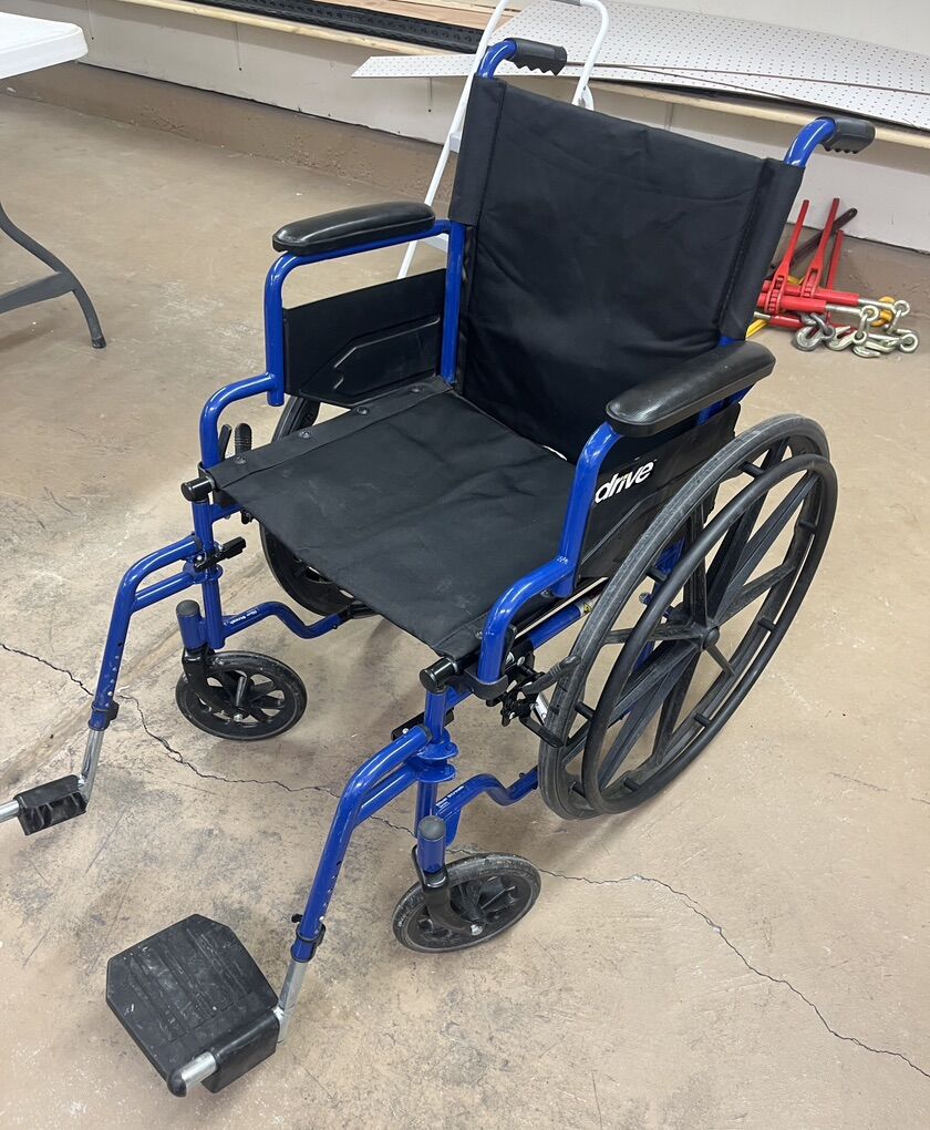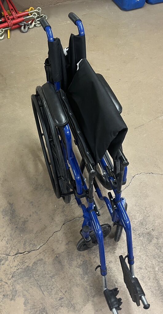 This is a Drive Blue Streak Series chair that folds for storage. We had it at our festival first aid booth and hardly ever used it. One of foot rests needs to be replaced. Rolls well and turns well.