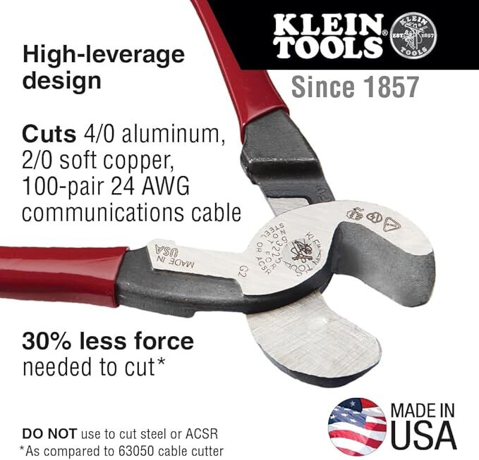 Klein Tools Cable Cutter (63225). 9-Inch High Leverage Cutter for Aluminum, Copper and Communication Cable. Made in USA