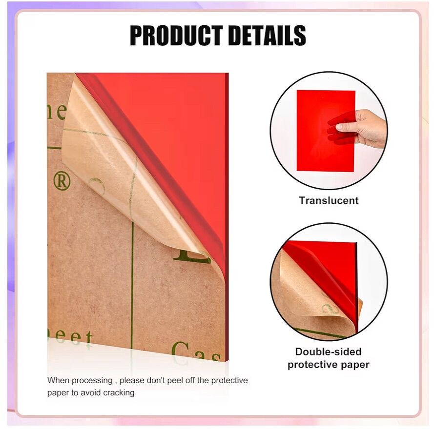Translucent red plexiglass red acrylic,with 2 pieces of red acrylic sheet,This acrylic resin has excellent optical stability and uniform thickness. red cast acrylic sheet is a type of sheet that is easy to penetrate and maintains color tones. It is an excellent choice for handcrafting, painting, logo, laser engraving, and is suitable for any project that requires transparent colored acrylic sheets. Colored acrylic can be used with any type of tool, laser cutting or carving, thermal forming, adhesive, paint, wire mesh, drilling, thermal forming, sawing, bending, etc. It is the perfect material for hundreds of process applications. Cast acrylic sheet uses high-quality raw materials to make the product.So our sheets have excellent rigidity and excellent performance.Imported color master batches are used in the production process, and there is no color difference in different batches of the product. We use double-layer bubble bags and pack to ensure that the corners of the product are intact. And We checked every sheet of acrylic carefully when packing.