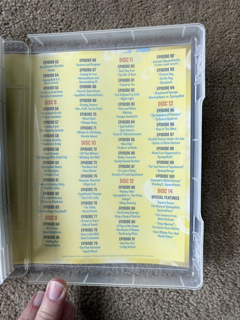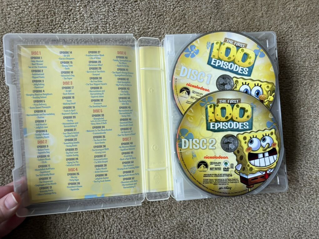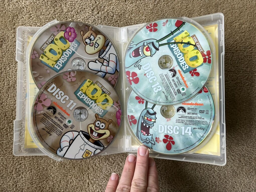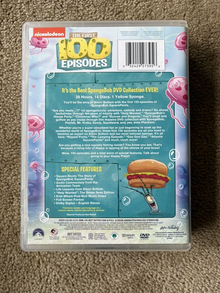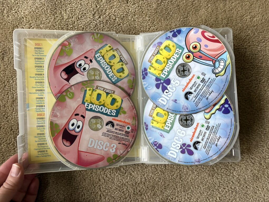 Spongebob DVDs: The First 100 Episodes. 38 hours, 14 discs. Nickelodeon, 2009. Disc 1 has a few slight scratches (still plays fine), others in excellent condition. Text only. Cash or Venmo.