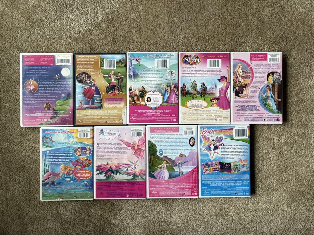 9 Barbie DVDs, 2001-2016: Barbie in the Nutcracker, in the 12 Dancing Princesses, & the Diamond Castle, and the Three Musketeers, as the Princess and the Pauper, in a Mermaid Tale, Fairytopia, of Swan Lake, and A Fairy Secret (NEW, sealed in plastic). Discs in very good to excellent condition. A few very slight scratches, all discs play well. Text only. Cash or Venmo.
