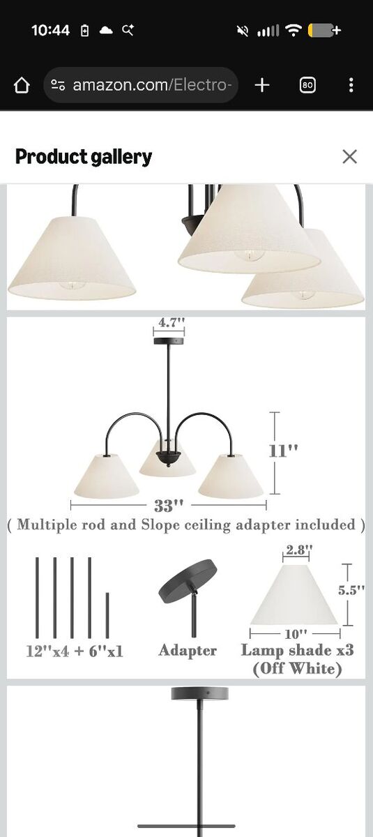 Black matte brushed fixture color with white linen shades. Dimensions are in the photo.