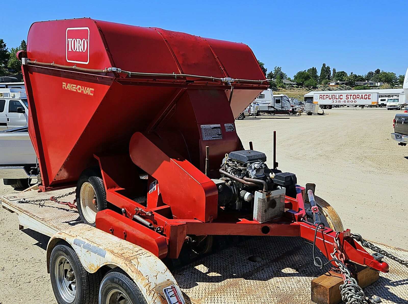 Toro Rake-O-Vac towable turf sweeper. Kohler 24hp gas engine, Rockford PTO, 1397 hrs. New battery, good mechanical condition. Located in Boise, Idaho. Call 208-860-8801