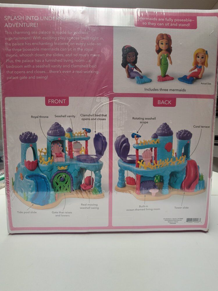 VenmoOriginal retail price $69.99! Splash into undersea adventure—this charming sea palace is made for endless entertainment! With exciting play spaces built right in, the palace has enchanting features on every side—so the 3 poseable mermaids can sit on the royal throne, whoosh down the slides and so much more. Plus, the palace has a furnished living room…a bedroom with a seashell vanity and clamshell bed that opens and closes…even a real-working palace gate and swing! Palace measures 14 1/2" in length. Item # DD808