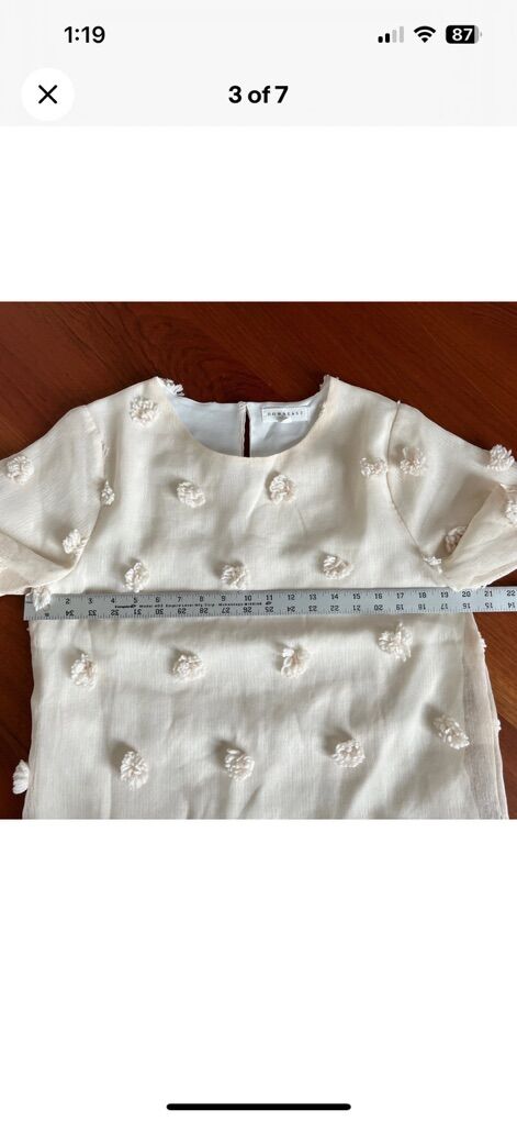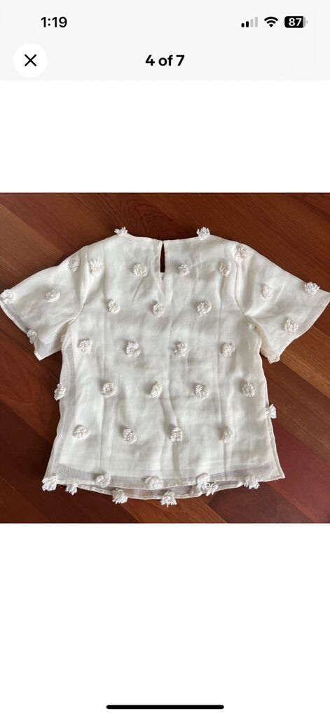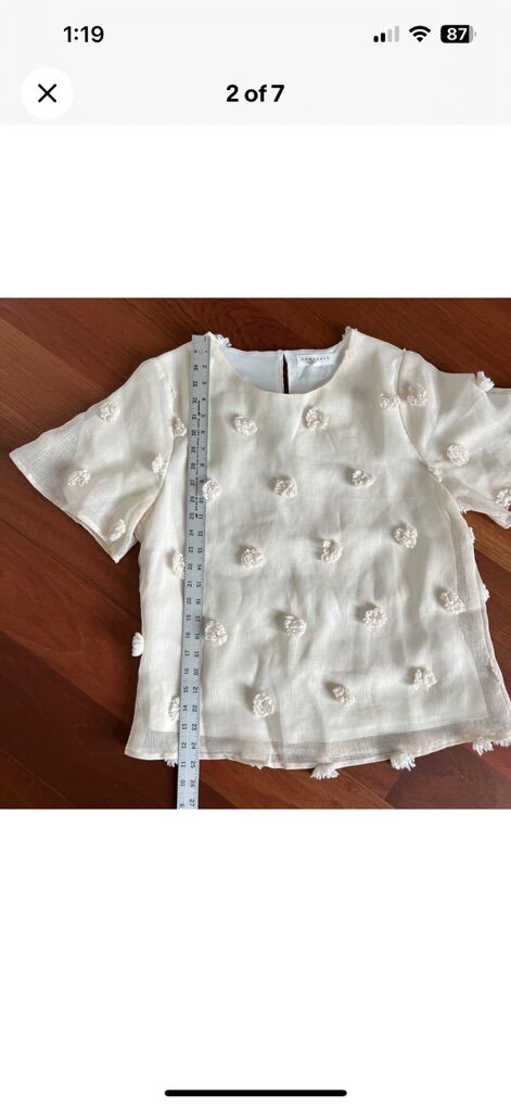 VenmoDarling, novel blouse with textured yarn polkadots. Only worn a few times. Side seams have been taken in to have a more flattering fitted a line. Measurements in photos reflect current sizing measurements.