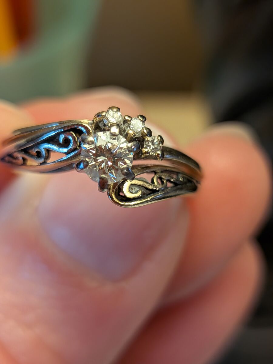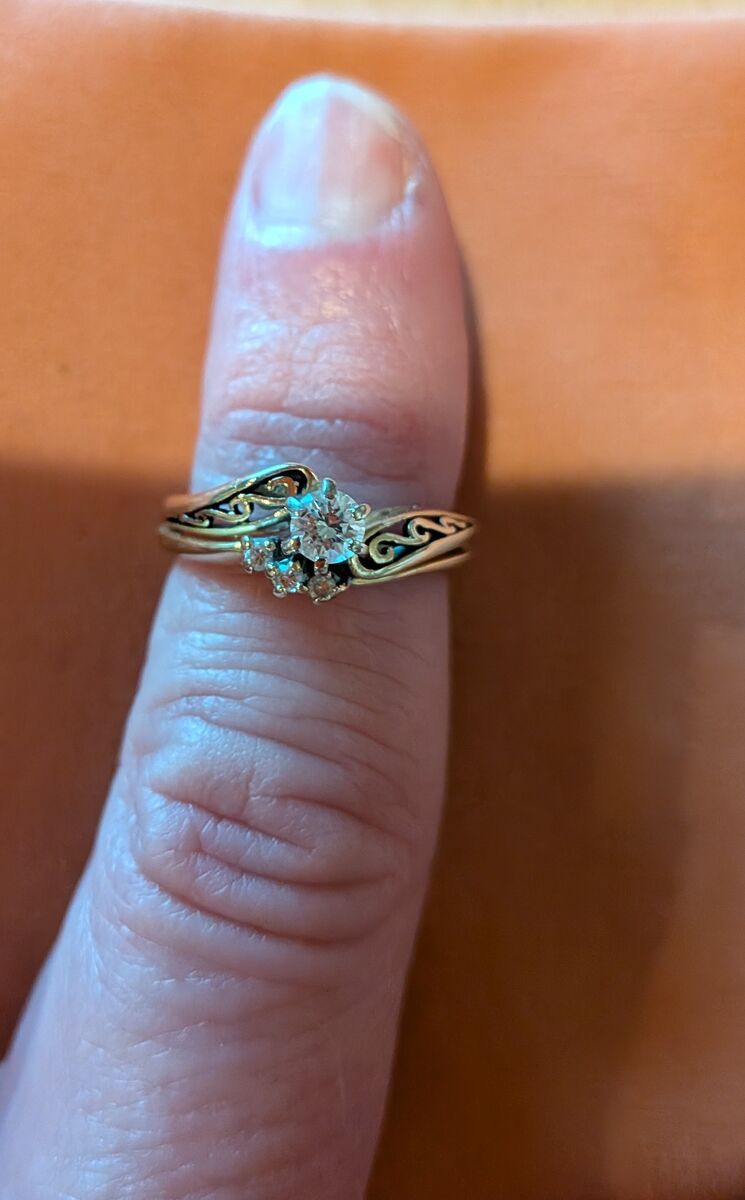 14 K gold ring, with one main diamond plus 3 smaller diamonds on engagement band.