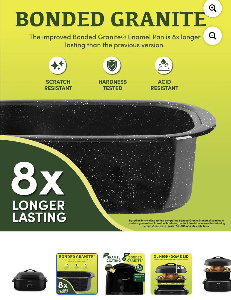 VenmoNew in box $50 Aroma® 18Qt. Electric Roaster Oven with High Dome Lid, 8X Bonded Granite Enamel, New-Black (ART-718BH) The Aroma ART-718BH is an 18-quart electric roaster oven, known for its large capacity (fits up to a 22-lb turkey), self-basting high-dome lid, adjustable temperature (150°-450°F) for roasting, baking, steaming, and keeping warm, featuring a stainless steel exterior with an enameled pan, and offering efficient, countertop cooking for holidays or everyday meals. It's a versatile kitchen appliance designed to cook faster and more efficiently than conventional ovens, often in a black or red finish, with a removable rack for easy lifting. Key Features & Specifications: Capacity: 18 Quarts, holds up to a 22-lb turkey. Temperature: 150°F to 450°F, with Defrost & Keep Warm settings. Design: Stainless steel body, high-dome lid, self-basting steam recirculation. Accessories: Removable stainless steel rack with handles, enameled steel roasting pan. Controls: Simple knob for temperature adjustment. Color: Often seen in black (ART-718BH) or red (ART-718R). Cooking Methods: Roasting, baking, steaming, slow cooking, buffet serving.