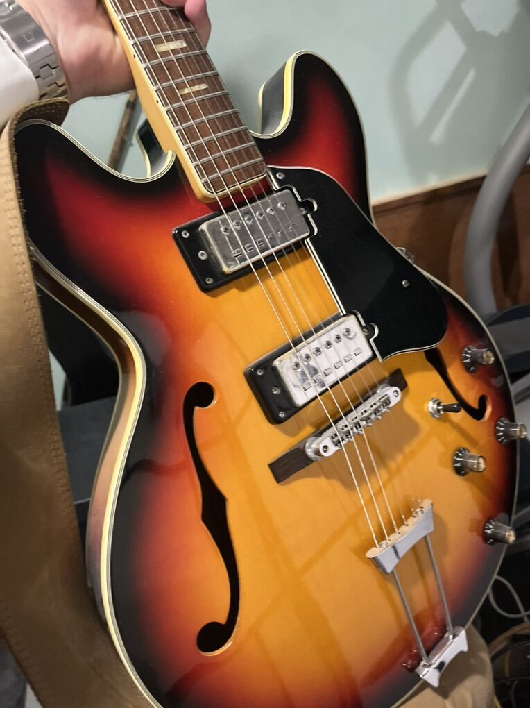 ApplePayThis is a cool vintage hollow body guitar in a cool starburst finish by Encore. Everything works. Comes with original cardboard guitar case..