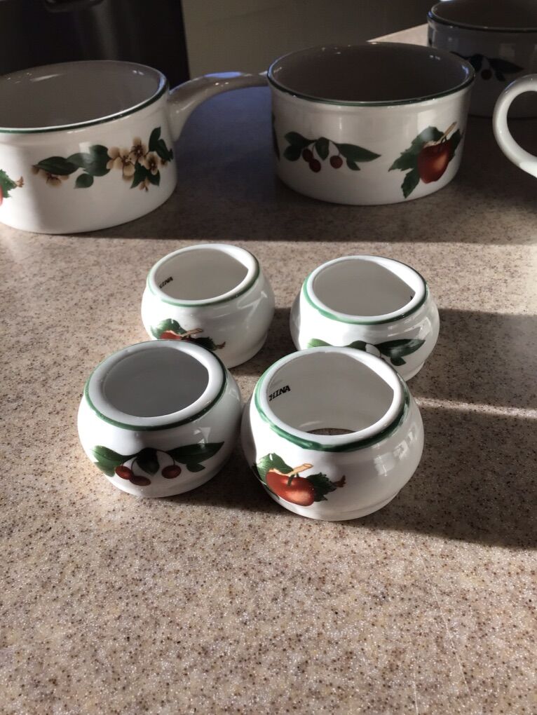 Venmo10 mugs, 8 ramekins , 4 soup bowls and 4 napkin rings. Each has cherry motifs on one side and Apple motifs on the other .