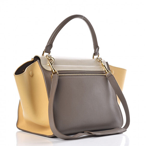 authentic CELINE Smooth Calfskin Medium Tri-Color Trapeze in Butter. This stylish tote is crafted of smooth calfskin leather in multicolors of white, grey, and yellow. The bag features a cross-over near-full-length frontal flap, rolled leather top handle, and an optional leather shoulder strap with brass hardware nad a stap. The flap opens to a spacious leather interior with hanging patch pockets.