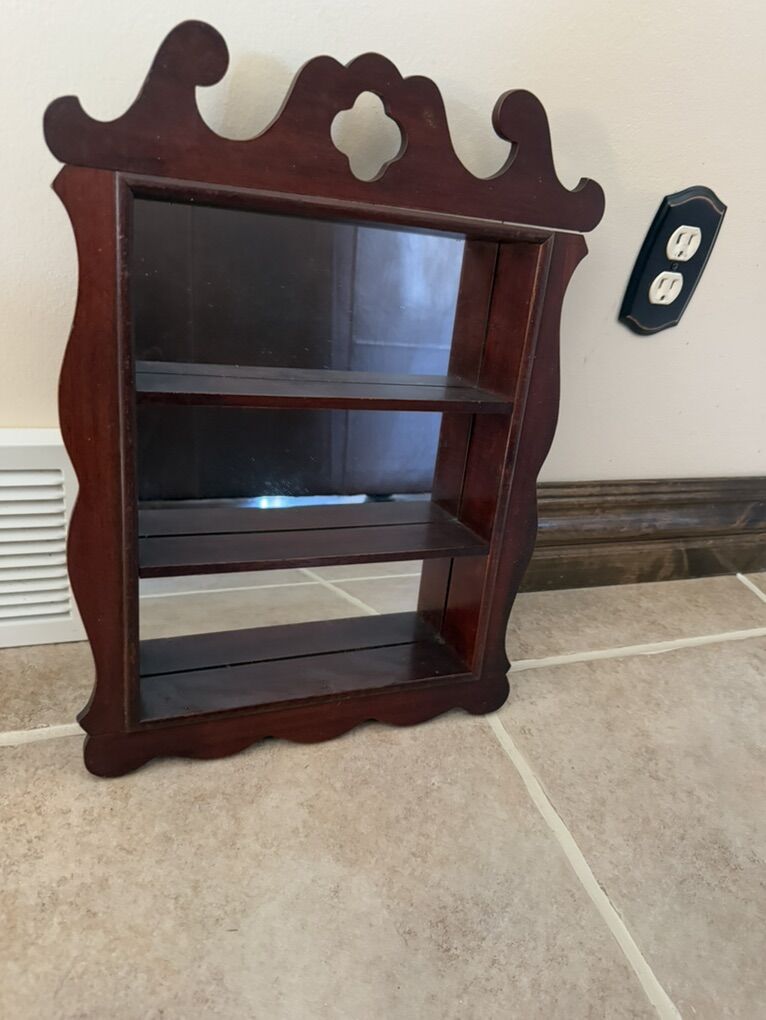 Antique wood mirrored ,tiered, shelf 19” T 14” W 2” D