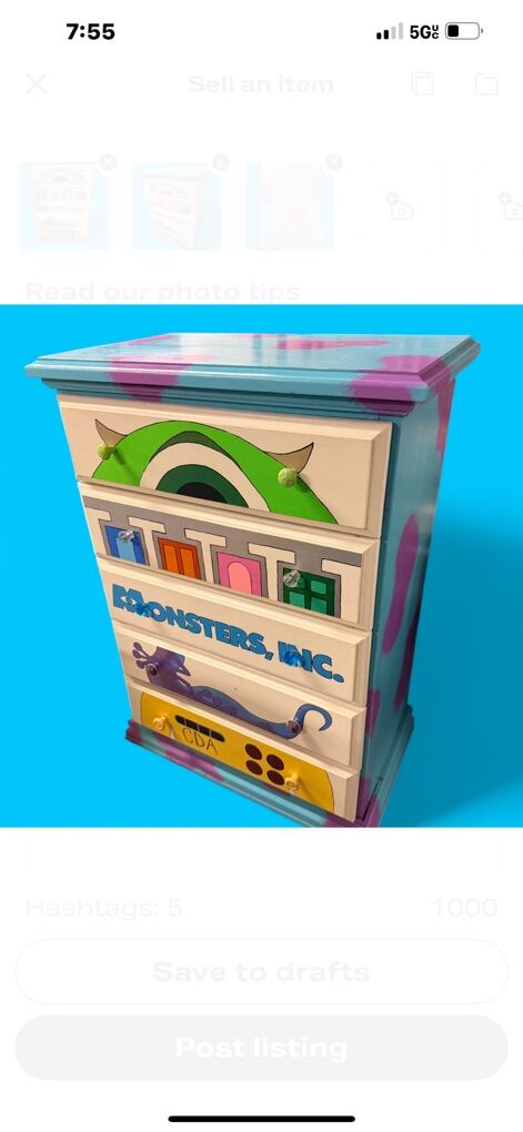VenmoThis is a custom hand-painted dresser featuring characters and themes from the Disney/Pixar movie Monsters, Inc.. The top drawer depicts the eye and horns of Mike Wazowski. The middle drawers feature the company logo and the CDA (Child Detection Agency) logo. The dresser incorporates popular characters and elements from the film, which is about a factory that powers the monster world with children's screams. The overall design is a unique, collectible piece of furniture based on the animated movie