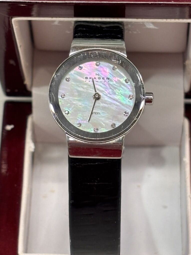 Vintage Skagen Women's Classic Watch. Stainless steel case, mother-of-pearl dial with crystal hour markers, and a black leather strap. Excellent condition, Located in Murray cash/Venmo. Fcfs or hold with Venmo