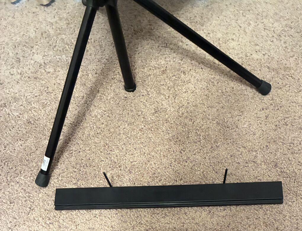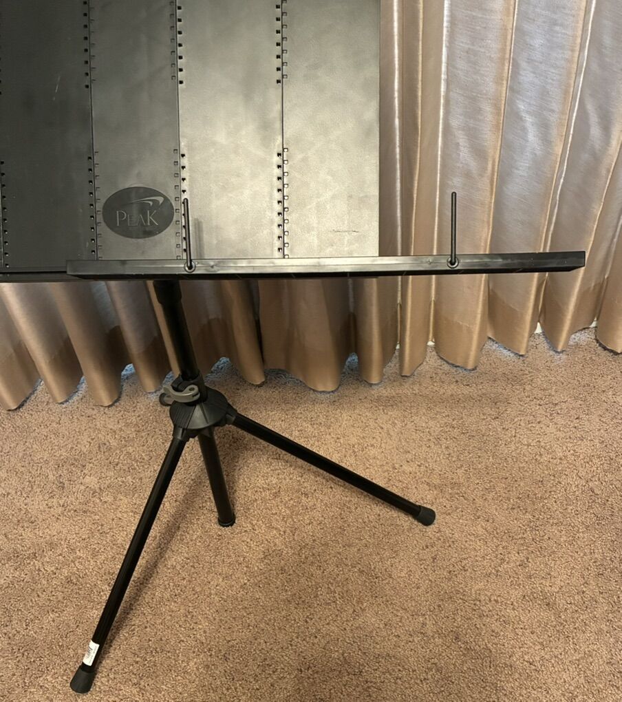 Trying to remove the two metal stands as they sold, but can’t seem to get rid of the photos, sorry. The collapsing /fold up one is left. & is $25. Tried to learn to play lots of different instruments in a blue grass group lesson setting. Both my husband and I played and at the senior center where we took the lessons, we could leave music stands, so we didn’t have to bring them back-and-forth, so some things are duplicate because we both had them and then we had two of them. They’re all adjustable heights up and down, Some collapse smaller than others; a couple have dual shelves, one for your sheet music to rest and just below a little shelf that you can put your clips and marking pencils, etc. One doesn’t have that, but it has a portable plastic dual shelf you can slip on and off. A couple of the standard width. One is extra wide & the one that’s plastic and folds up I confess I don’t even remember which instrument I got that for, but I don’t think I used it very much. Somebody should enjoy them.,