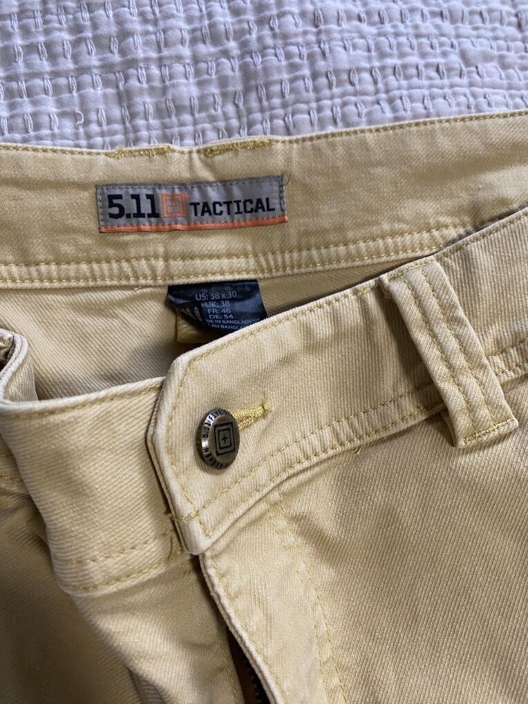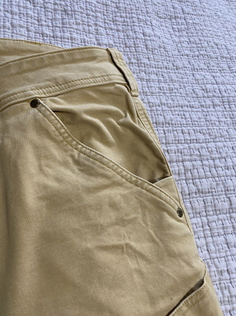 Jean fabric. These are a light mustard. I wore them less than five times.