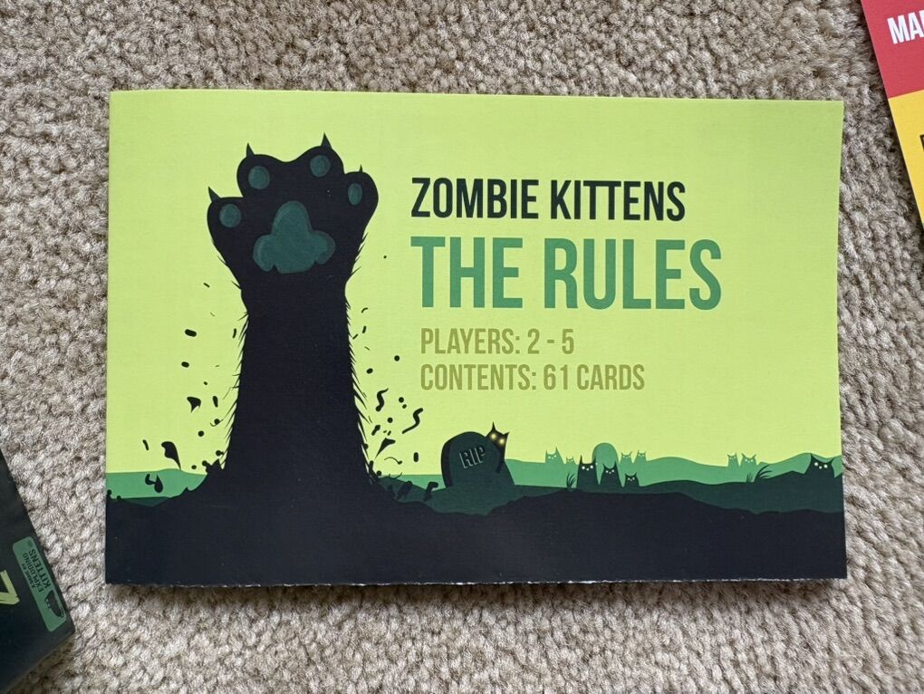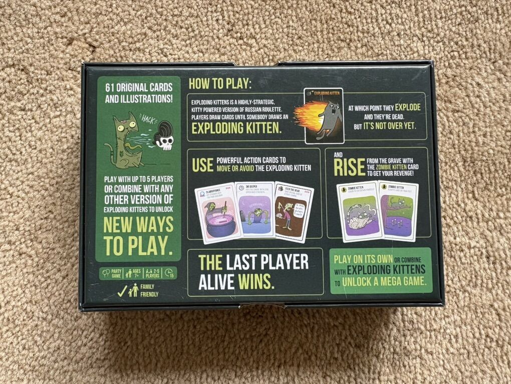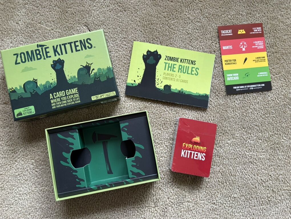 NEW (open box, sealed components) Zombie Kittens: A card game where you explode and then come back to life and then maybe explode again. A game by Exploding Kittens, 2022. Ages 7+, 2-5 players. New, unplayed condition. Text only. Cash or Venmo.
