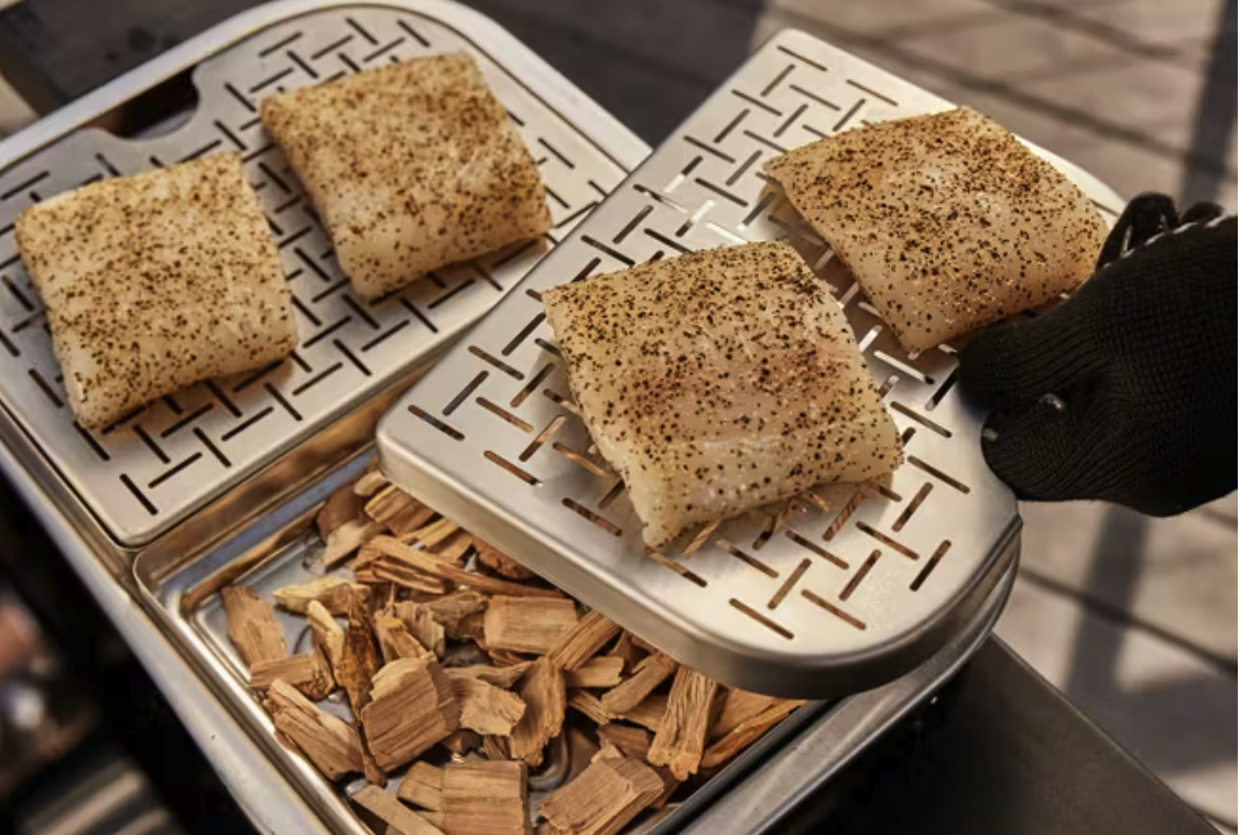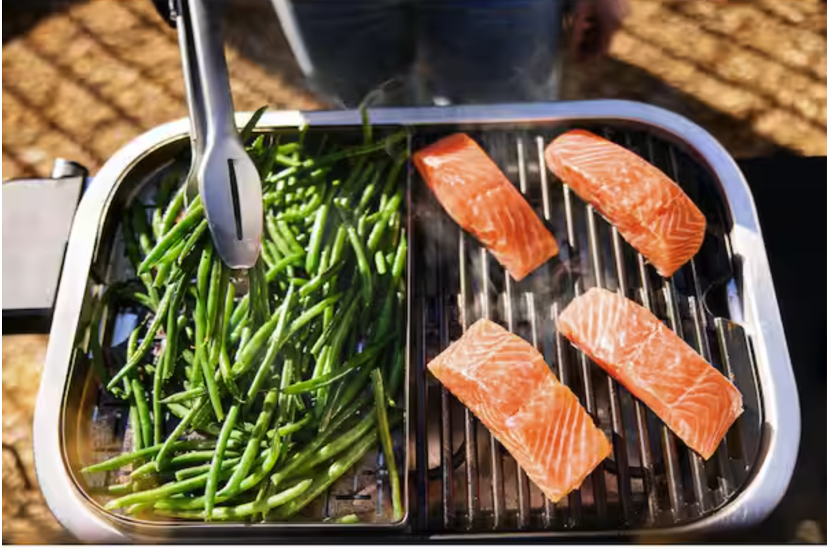 237 sq inches of cooking area. This Weber grill is lightly used and is a real nice grill and smoker. Reaches temperatures over 600 degrees for the perfect sear. Sear,smoke,grill, steam, boil all on one unit. Perfect for balconies, patios and decks. I give this a rating of 5 stars and have found it to cook very well for the times i have used it. NO charcoal, no gas, just set the temperature and cook. Cooks from frozen also. Comes with the added versatility expansion kit and cover. NOTE this is the full size lumin not the compact. See more at Weber.com. With accessories added the price was $543 plus tax..