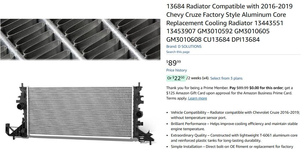 ApplePay13684 Radiator Compatible with 2016-2019 Chevy Cruze Factory Style Aluminum Core Replacement Cooling Radiator 13443551 13453907 GM3010592 GM3010605 GM3010608 CU13684 DPI13684