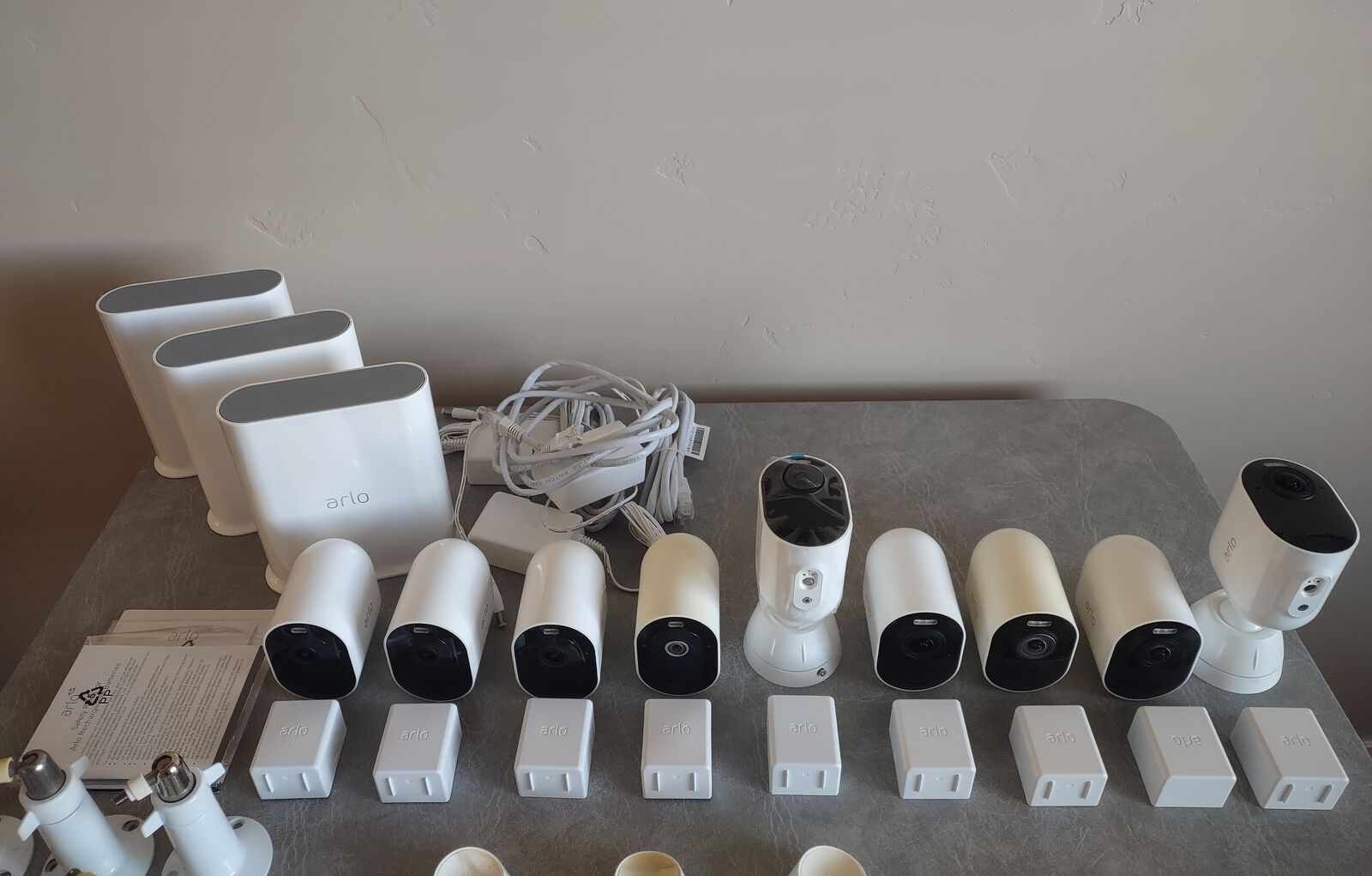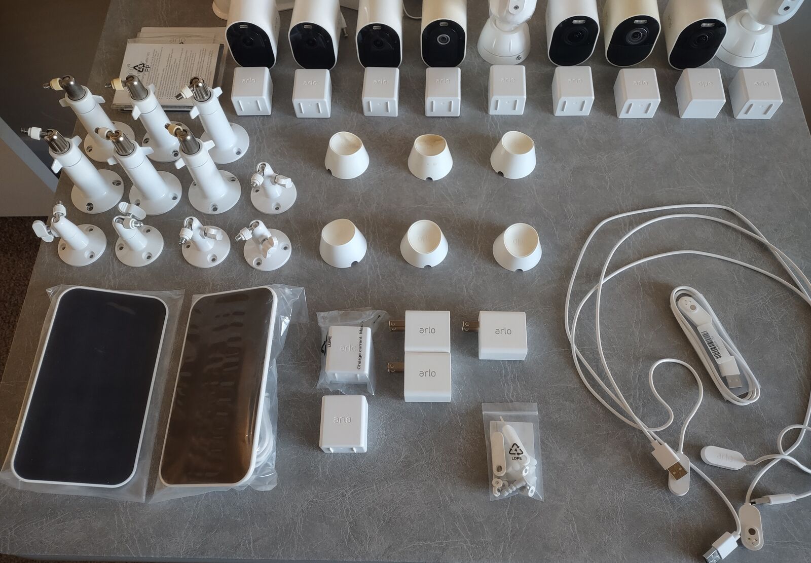 Arlo WiFi Cameras. 9 in total camera's. 4 camera's are 2k with 3 in new condition. 5 camera's are 4k with 4 in new condition. 6 magnetic camera mounts and 11 camera or solar panel tiltable mounts, 6 large mounts and 5 small mounts. 4 USB camera power cords. 3 USB power adapters. 2 new solar panels for charging camera's outdoors. All camera's have a battery and their is 2 extra batteries. 3 camera base stations that you can add up to a 2 tara bite USB drive for backing up your cameras. $220. or best offer.