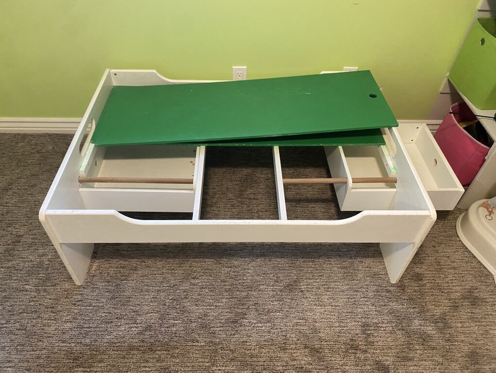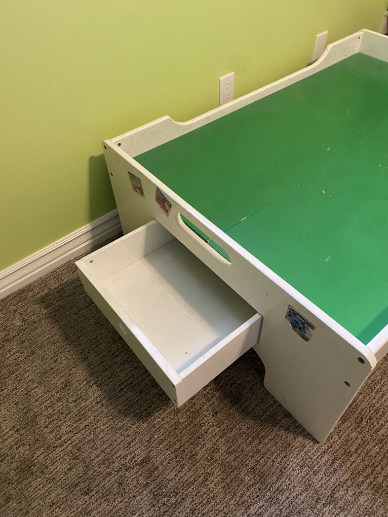 VenmoKids play table with drawers on each end. Top panels remove. Dimensions are 47 L by 37 W by 16 H.
