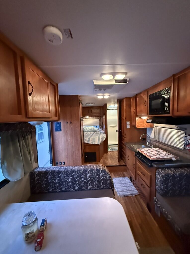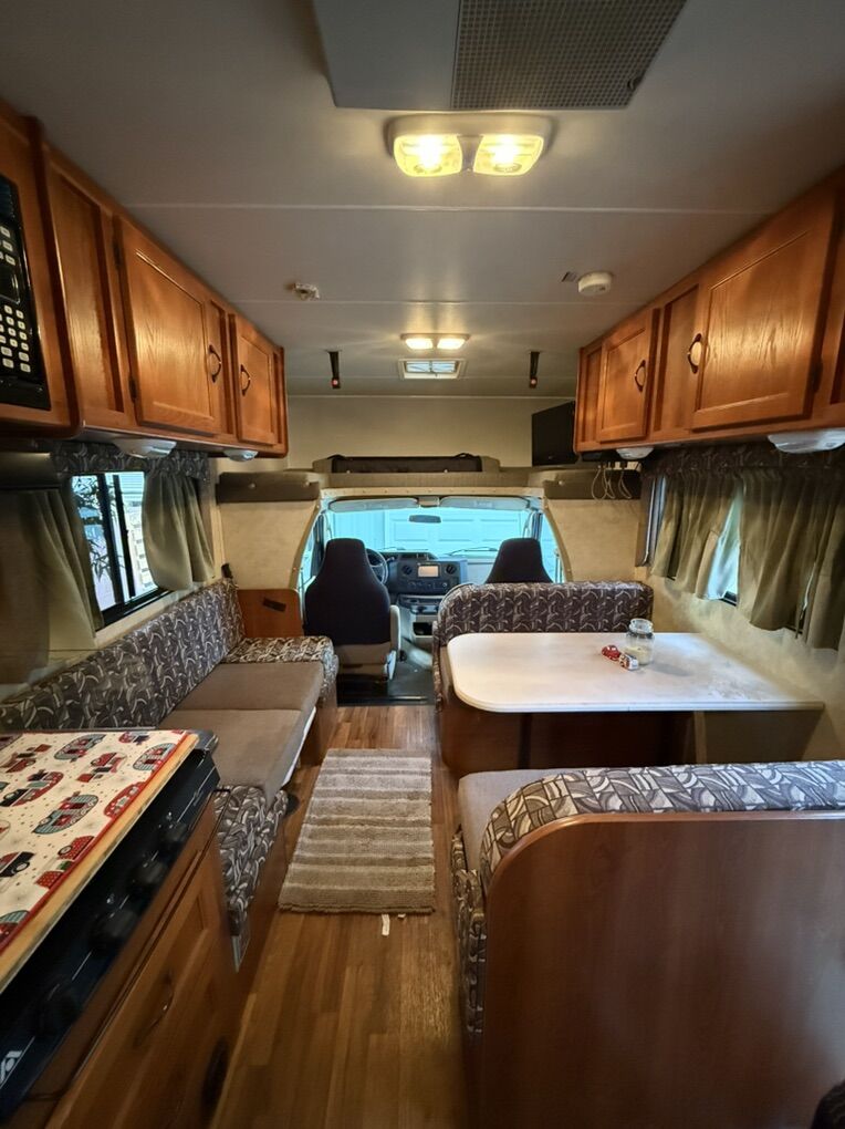 A little faded on the outside but looks great on the inside. And the miles… All appliances work great, has new awning matches the fade colors outside. New Dual 6 volt batteries on the inside and new battery for motor.