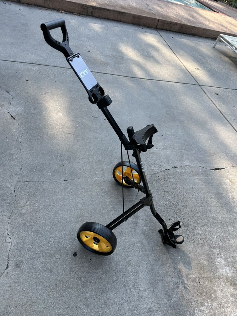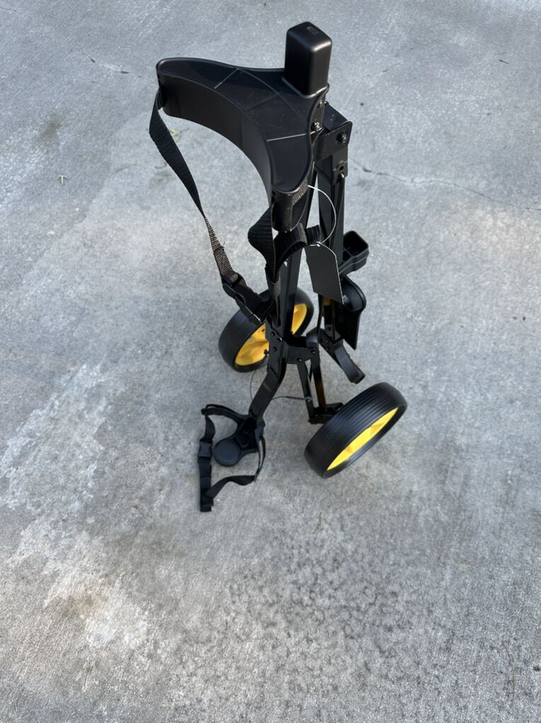 Venmo• ALUMINUM FRAME: The cart comes with strong and light aluminum frame which shows outstanding sturdiness and stability. • SCORECARD HOLDER: It is designed compact and with waterproof material. • UPPER AND LOWER BAG BRACKET WITH STRAPS: The adjustable straps ensure golf bags of different size fit well. • MAINTENANCE-FREE WHEELS: 2x9.5 wheels with EVA cover provide smooth riding on different terrians. • LIGHT-WEIGHT AND EASY CARRYING: The product weighs only 5.95lbs and with a folding size of 15.4x 14.8x35.4-inches, making it easy carrying