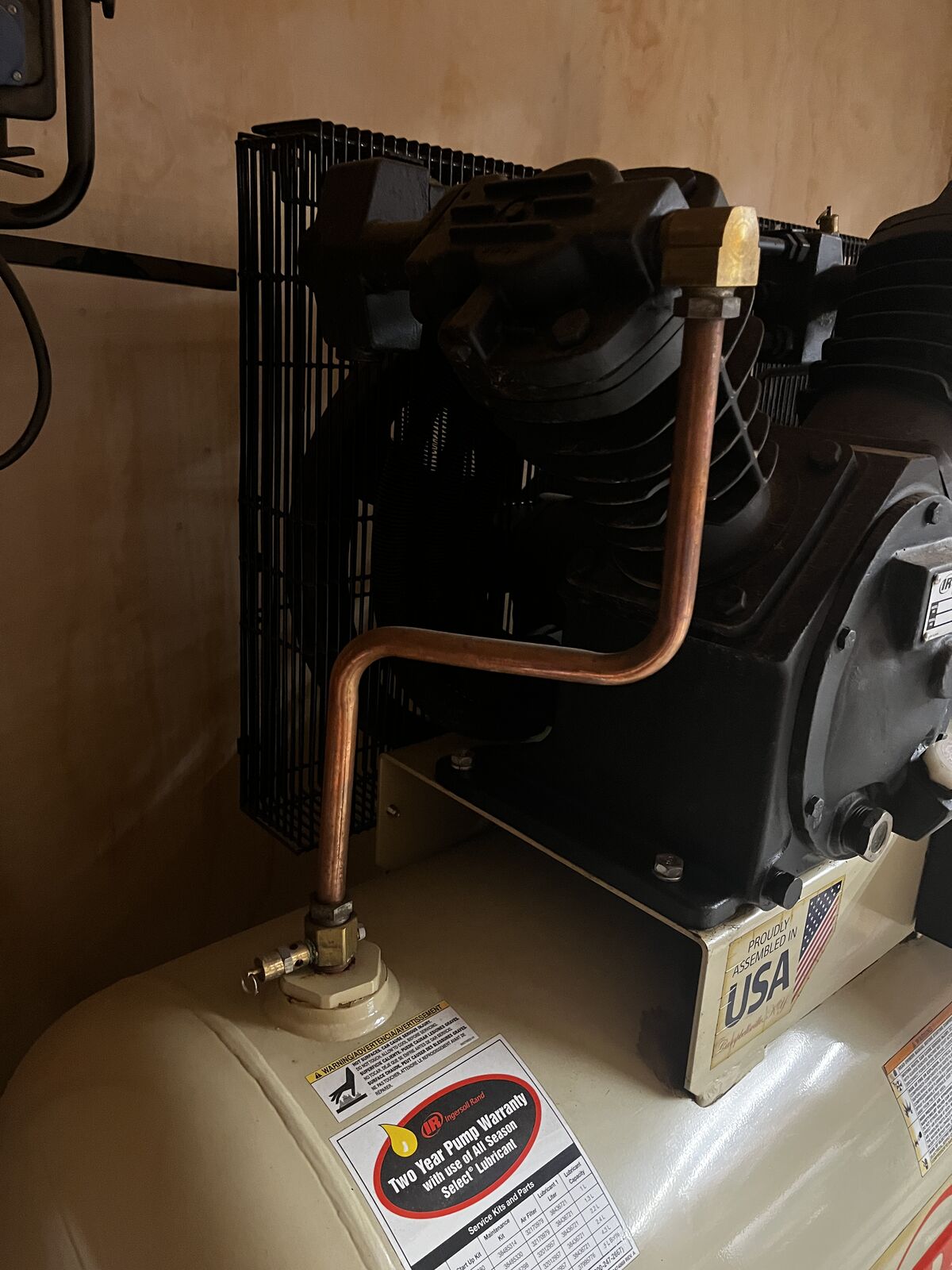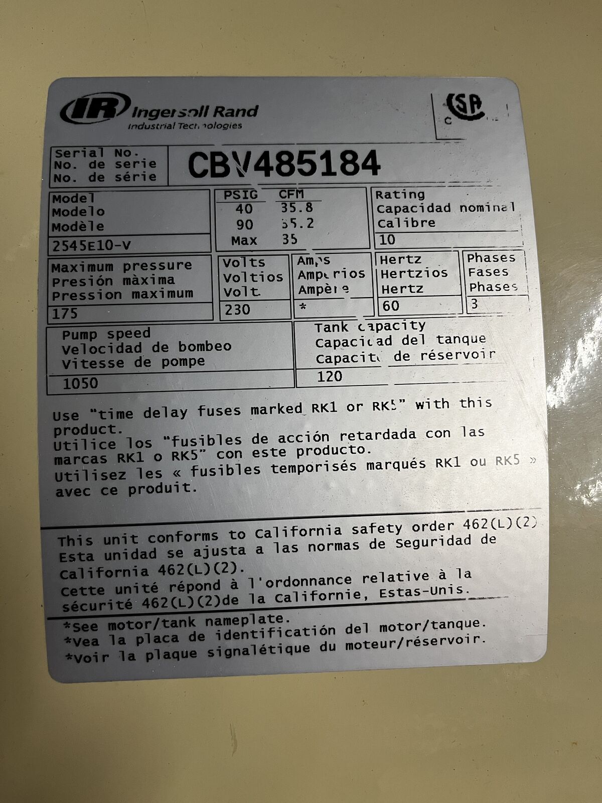 This is a New Ingersoll Rand model 2545e10-V air compressor. It is off the original pallet but hasn't been hooked up. Quick specs 10hp 230v 3 phase, 35 cfm, 175 psi 2 stage pump, 120 gallon tank. Being that it is new, there isn't anything to note about it.