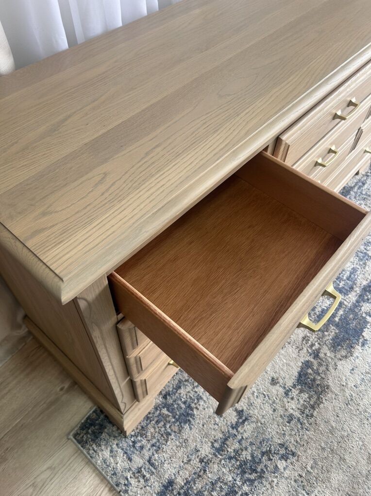 VenmoLarge vintage 9 drawer solid oak dresser refinished in a light finish and triple sealed for durability and protection. New gold hardware to give it a modern look. Drawers have all been deep cleaned and conditioned to be like new. Built in wooden drawer tracks all function smoothly. Dimensions: 65.5” L x 18” W x 32” H Dresser is heavy! Dresser will be at the front of the garage for easy loading. Curbside/garage delivery is available for an additional fee pending on location. I will deliver anywhere in Utah. A non-refundable deposit is required for delivery. Cash or Venmo only First come first serve