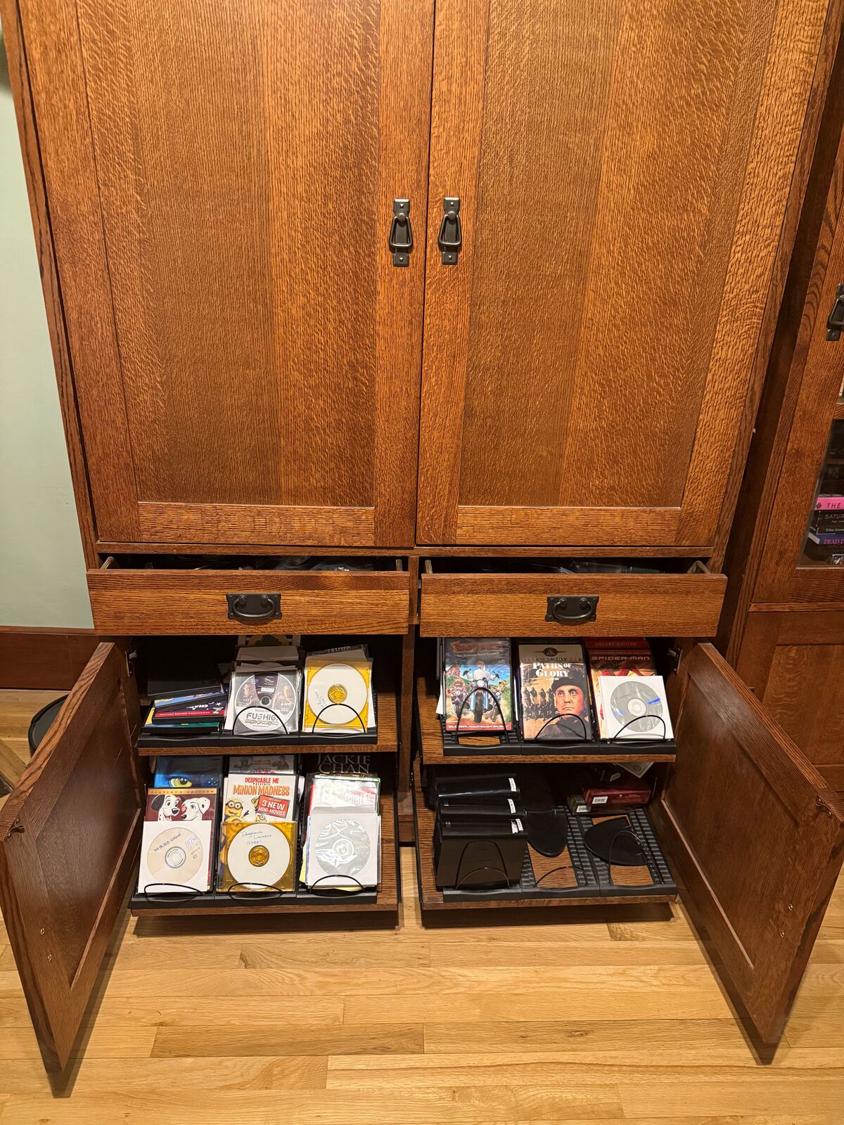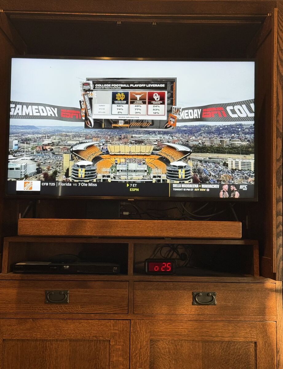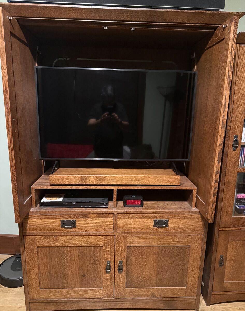 ApplePaySolid quarter-sawn oak TV cabinet dimensions/ entertainment center. Pull-out TV stand. Two storage drawers. Large storage cabinet with pull-out shelves for for DVD’s or whatever else you like. One owner. Paid $1,500 new. Included: Samsung 43 Class QLED 4K Q60D TV, and Vizio 5.1 Soundbar. Dimensions: 74”H x 47”W x 22”D (Crown molding adds 1-3/4” to depth and 3-1/2” to width at top). Both the cabinets and TV are in excellent condition.